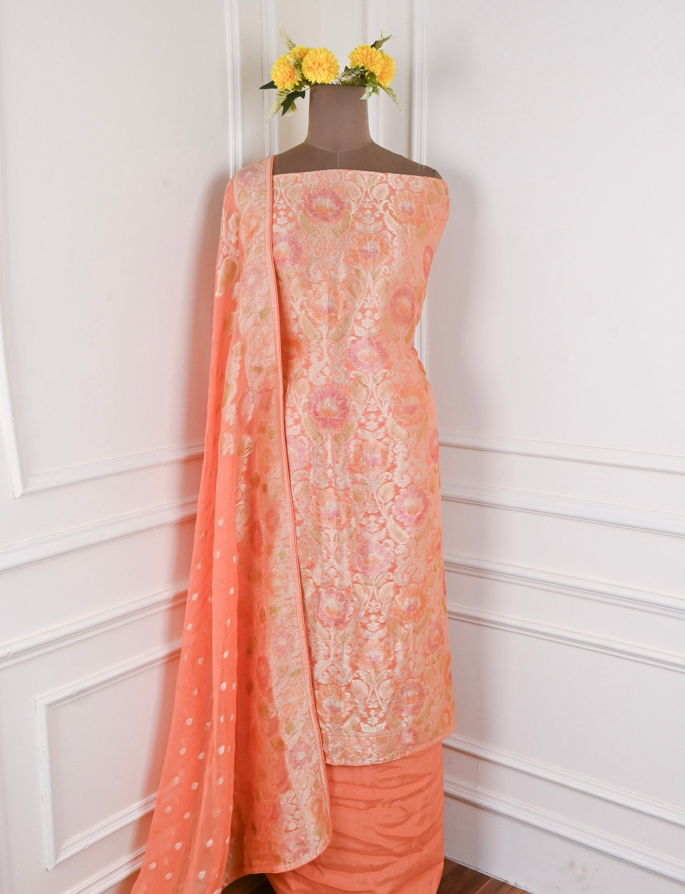 The Banarasi Orange Unstitched Suit showcases exquisite Banarasi fabric in a soft orange shade, offering a versatile base for creating a custom garment. This unstitched suit allows artisans and designers to tailor it precisely, ensuring a perfect fit and style. Ideal for occasions requiring traditional elegance combined with personal expression, this fabric promises both comfort and the enduring beauty of classic Banarasi craftsmanship.