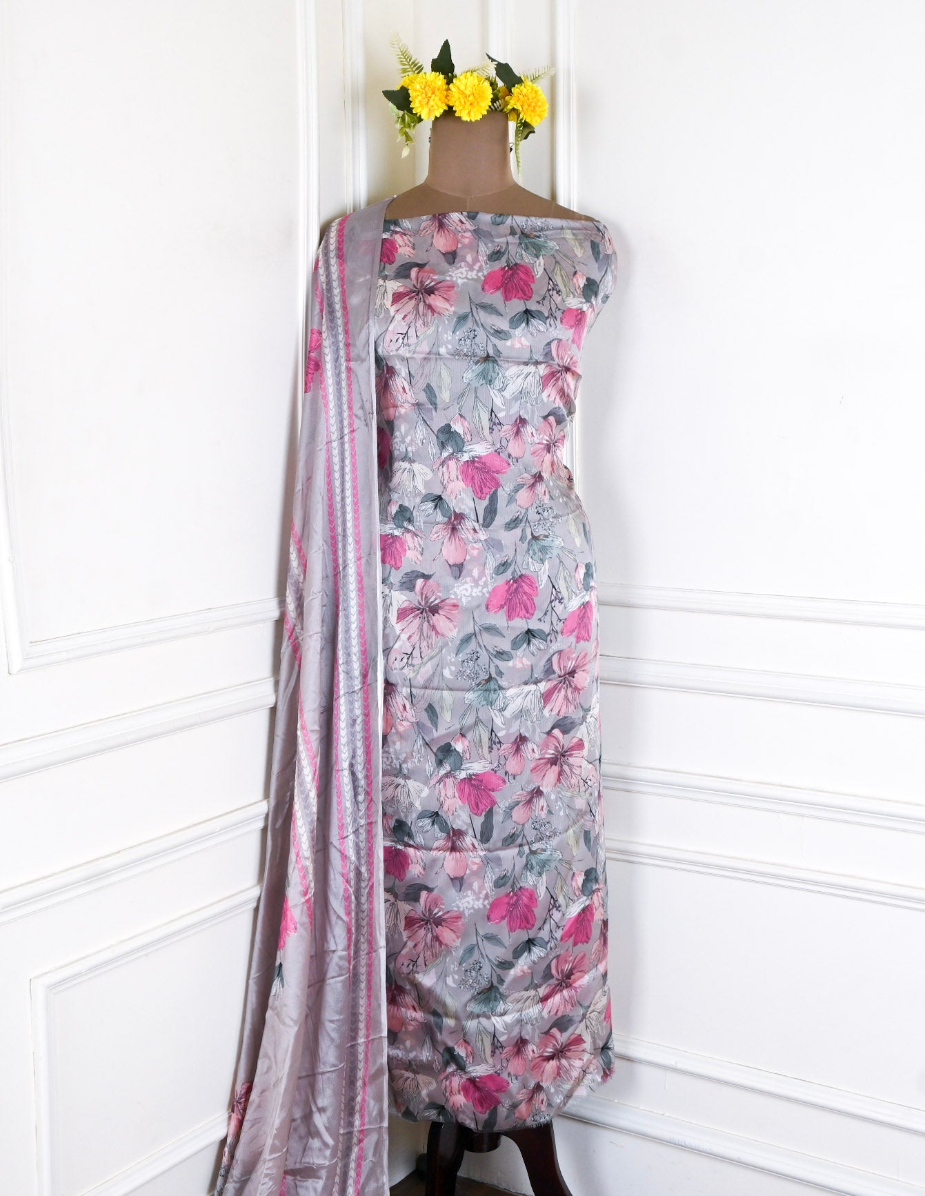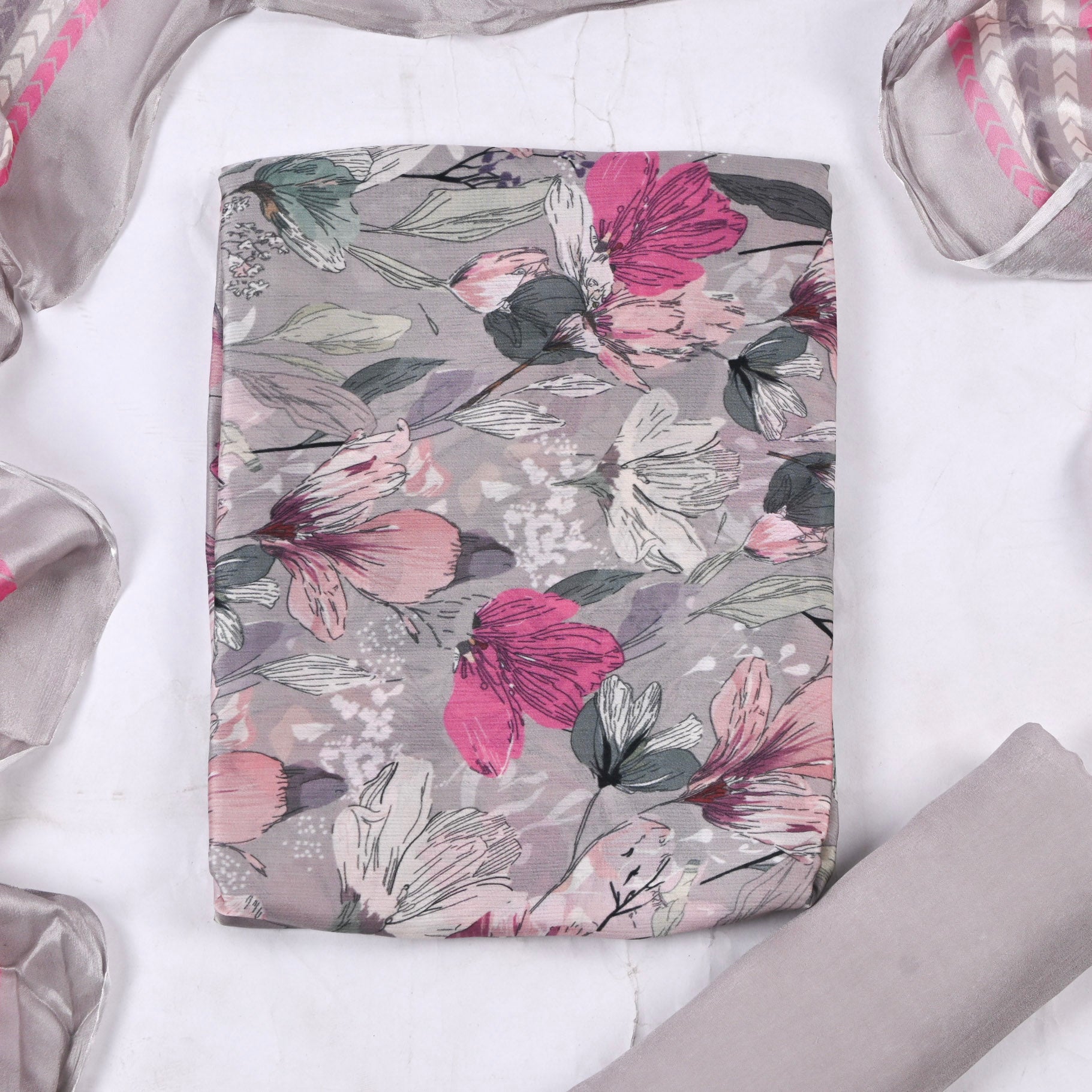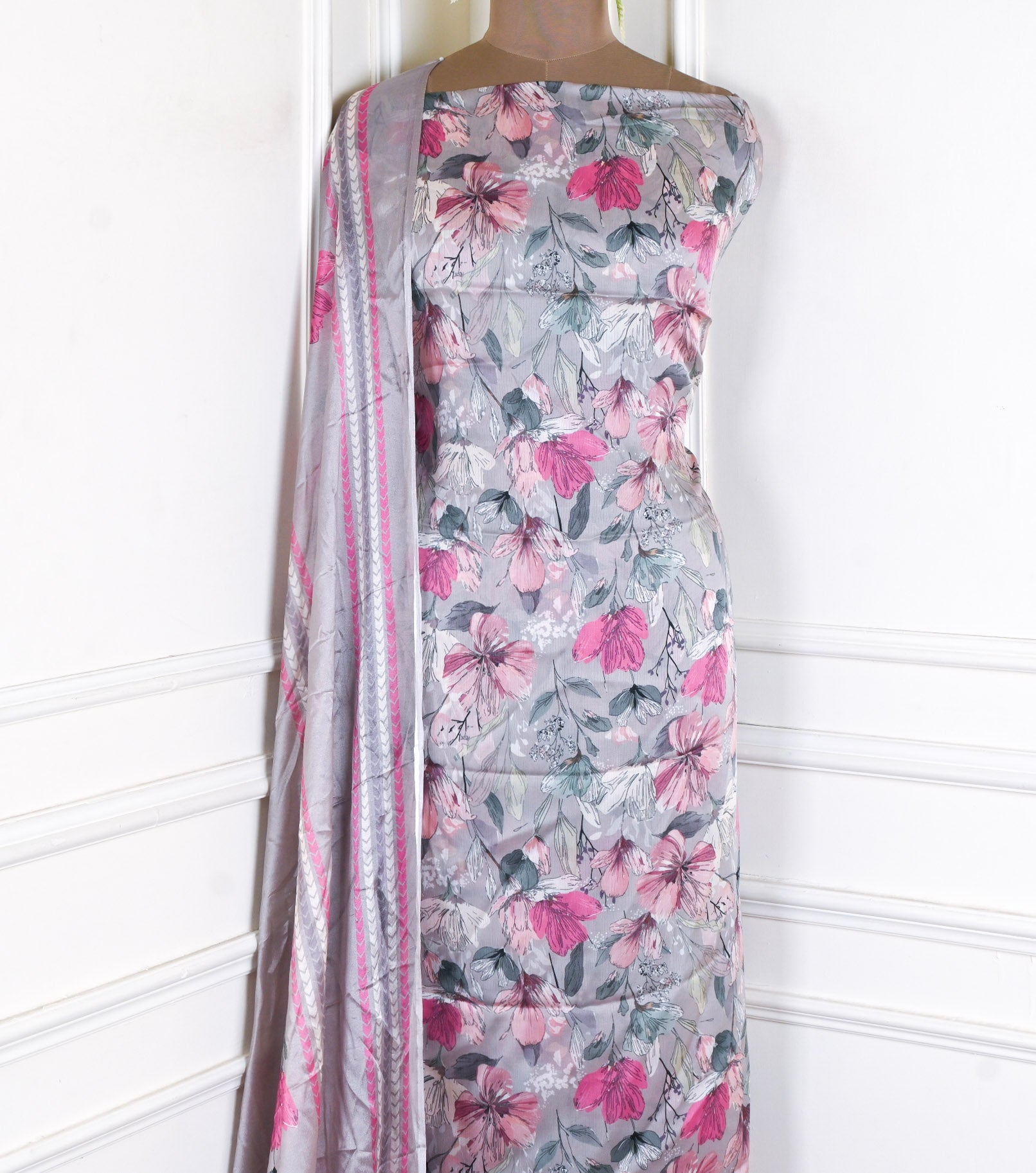 This Chinon Grey Unstitched Suit, crafted from premium quality fabric that combines elegance with comfort. The rich, verdant grey hue offers versatility for both casual and formal occasions, while the unstitched format allows complete customization to your preferred fit and style. Chinon fabric is renowned for its smooth texture, subtle sheen, and breathability, making it an ideal choice for the Indian climate. Perfect for creating a tailored ensemble that reflects your personal aesthetic, this suit provides the foundation for a polished, refined look that transcends seasonal trends.