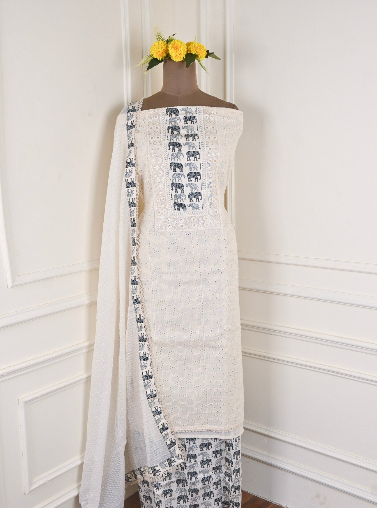 This Cotton black & White Unstitched Suit offers versatile fabric ideal for custom tailoring. Crafted from breathable cotton, it ensures comfort and durability, making it suitable for various occasions. The classic black & white color combination provides a timeless aesthetic, allowing you to design a personalized outfit that reflects your style with expert precision.