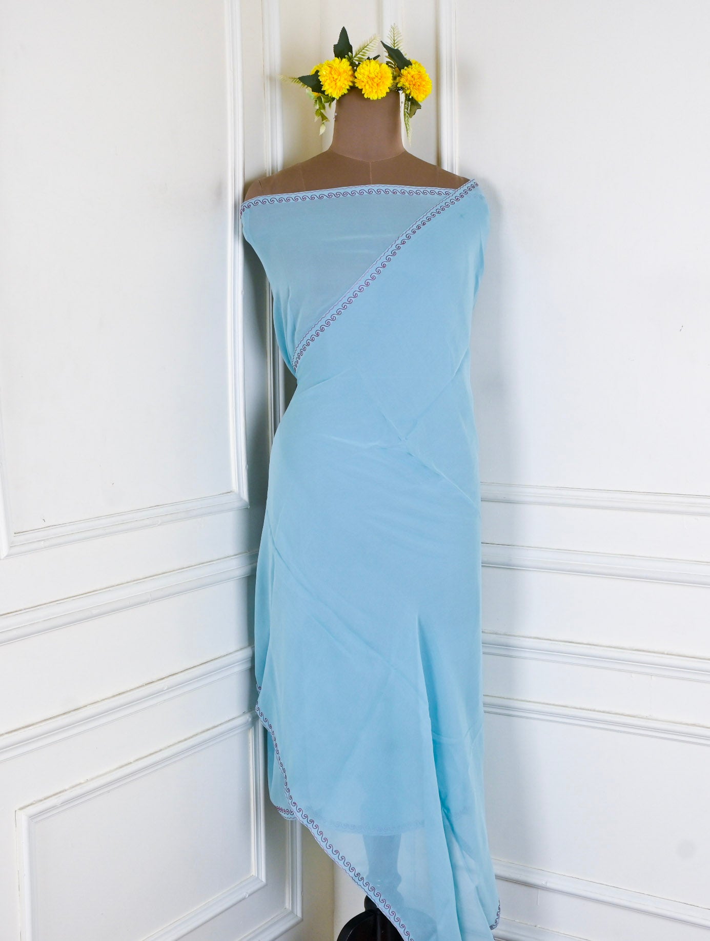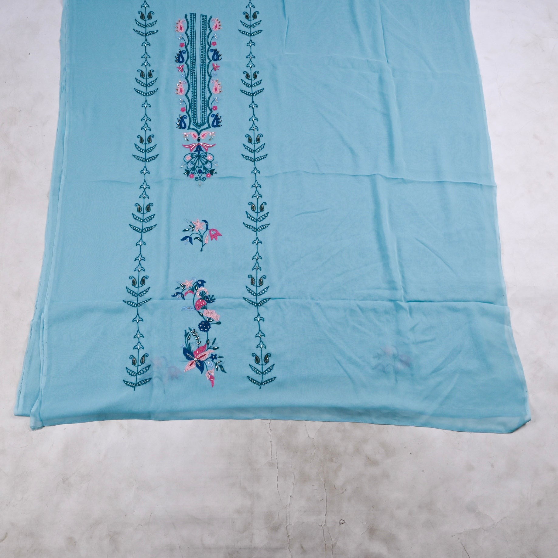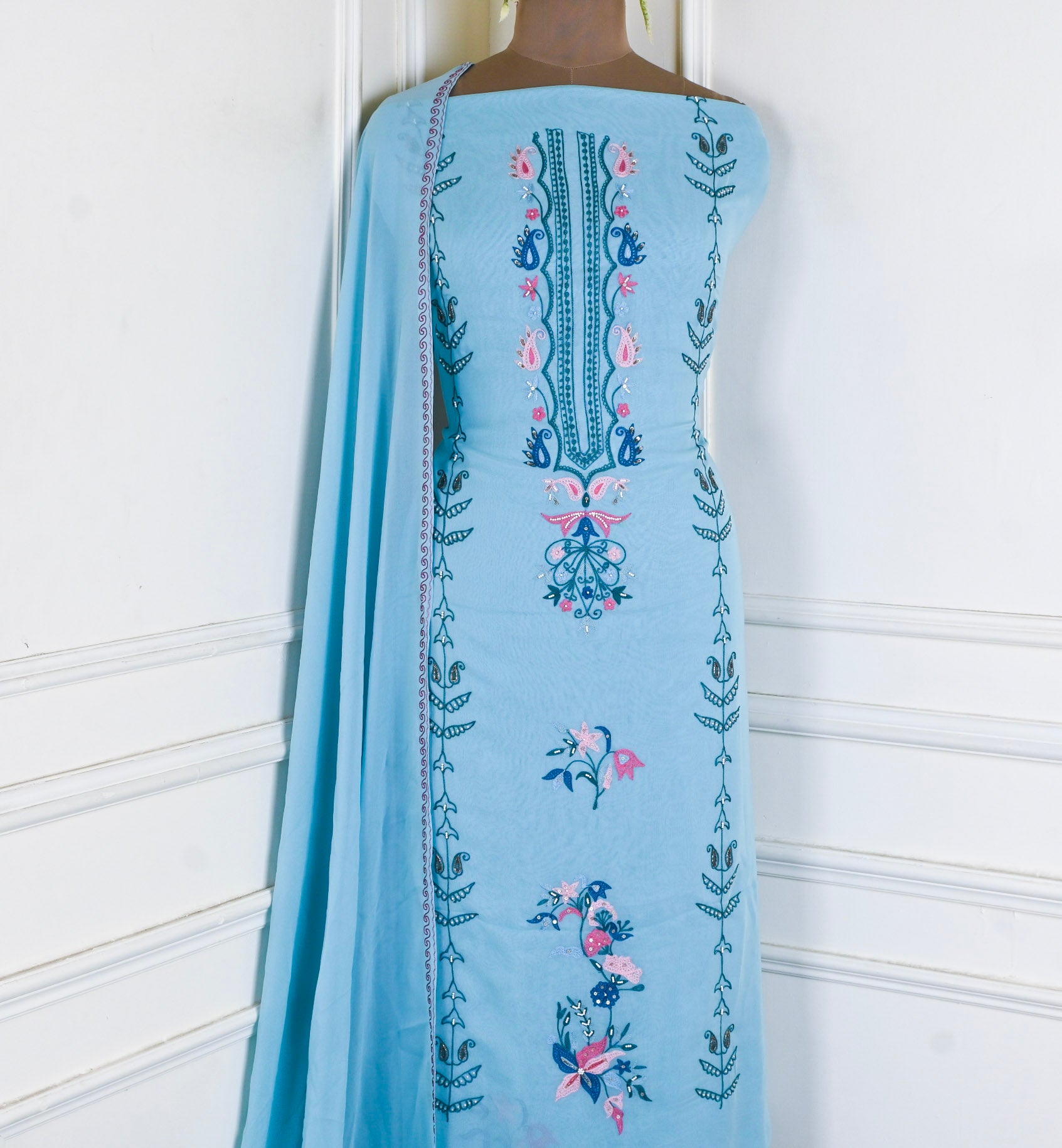 This Georgette Sky blue Unstitched Suit, crafted from premium georgette fabric renowned for its lightweight drape and breathable comfort. The delicate sky blue hue offers versatile styling possibilities, seamlessly transitioning from casual gatherings to formal occasions. As an unstitched suit, it provides complete customization freedom—tailor it to your exact measurements and personal preferences for a truly bespoke fit.