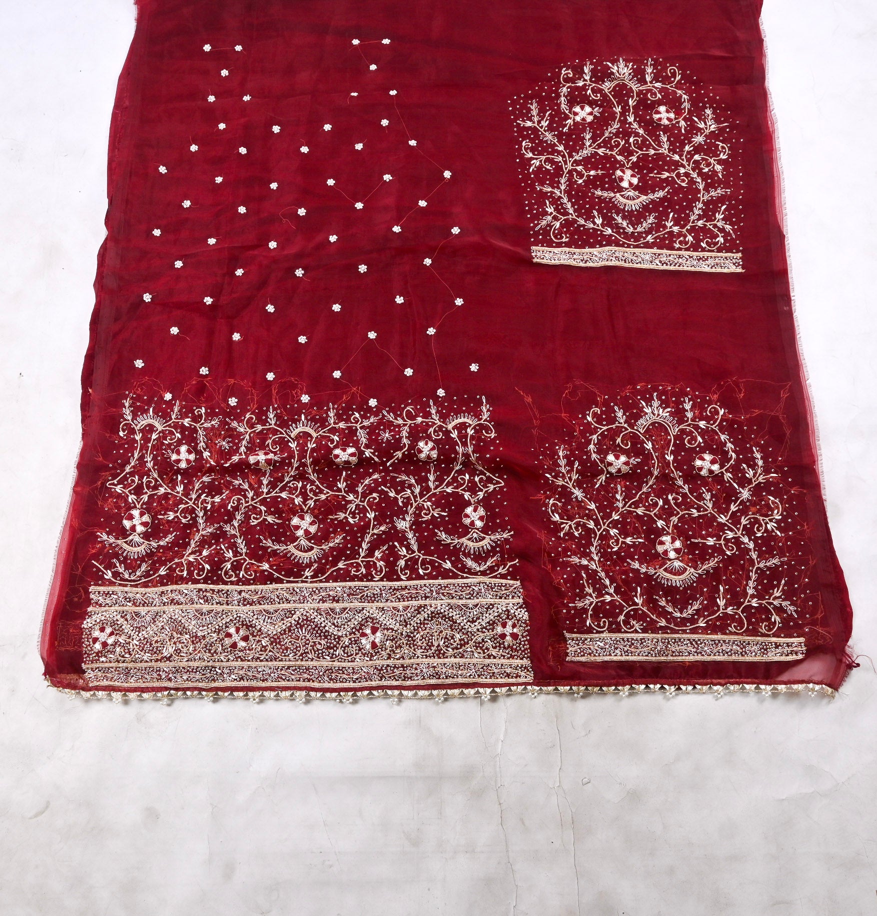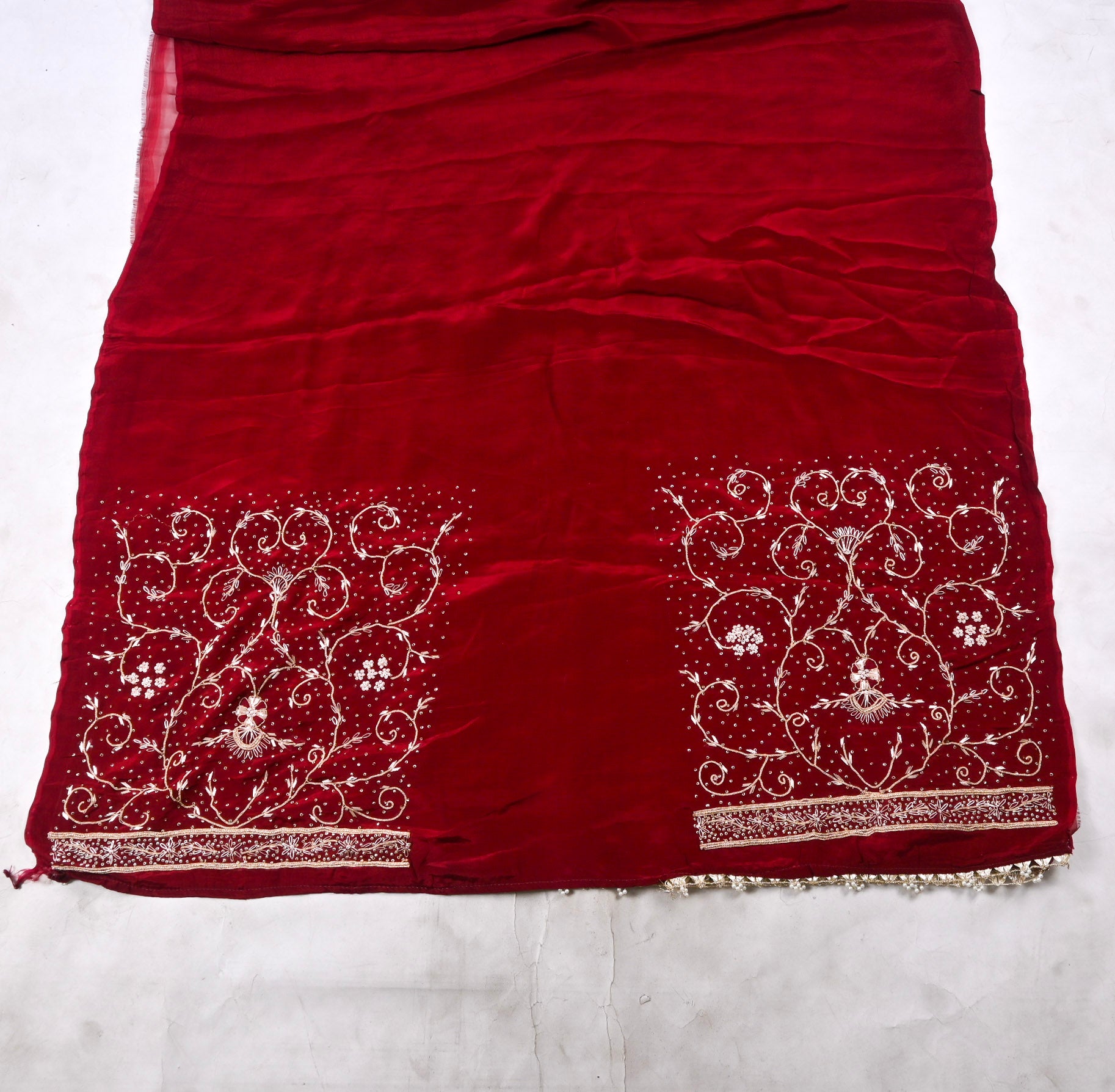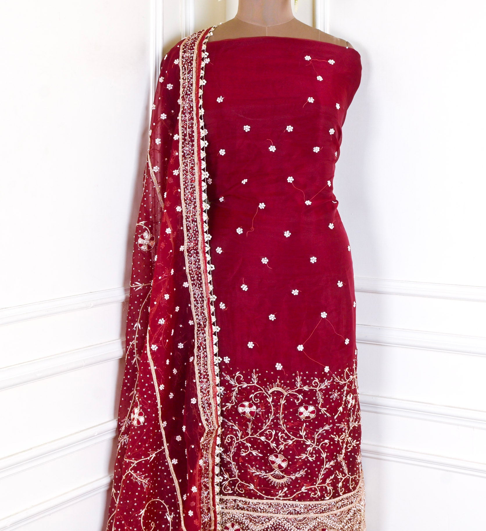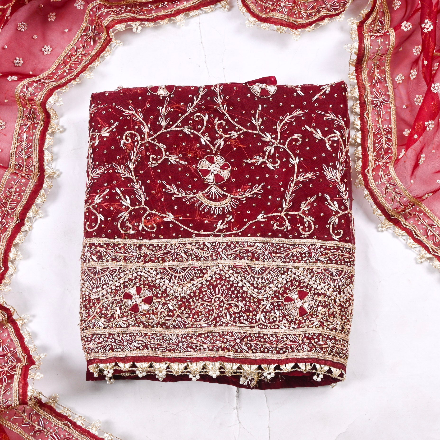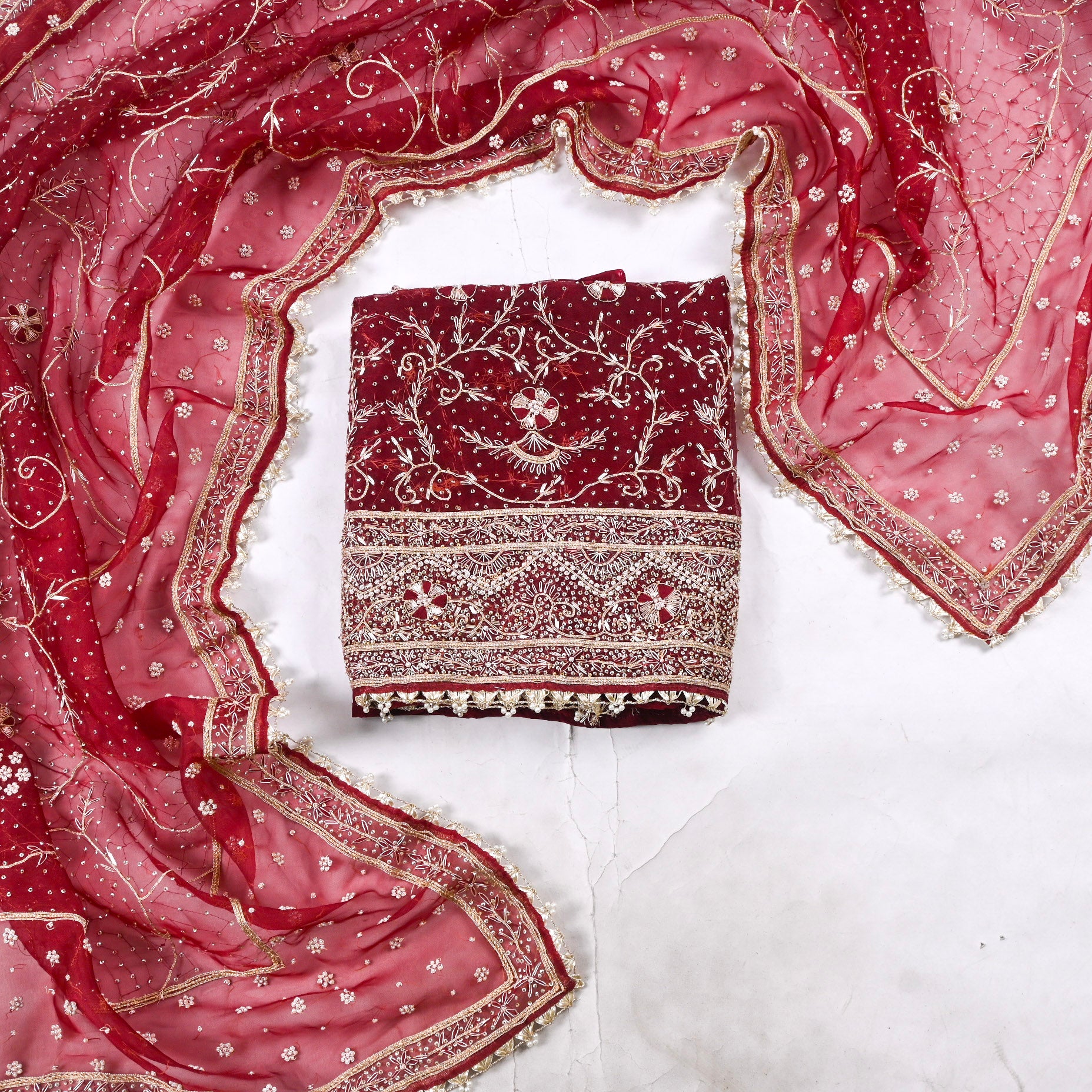 - Accompanied with an unstitched Crepe bottom and Glass Shimmer dupatta.