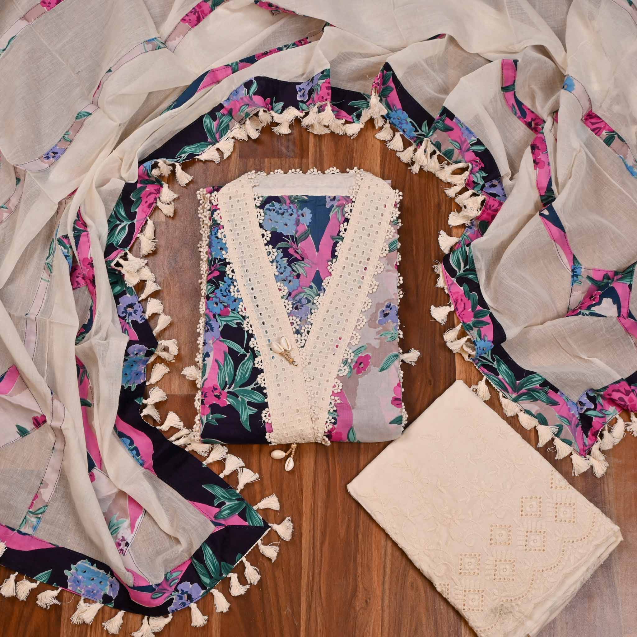 - Accompanied with an unstitched Chicken cotton bottom and Cotton dupatta.