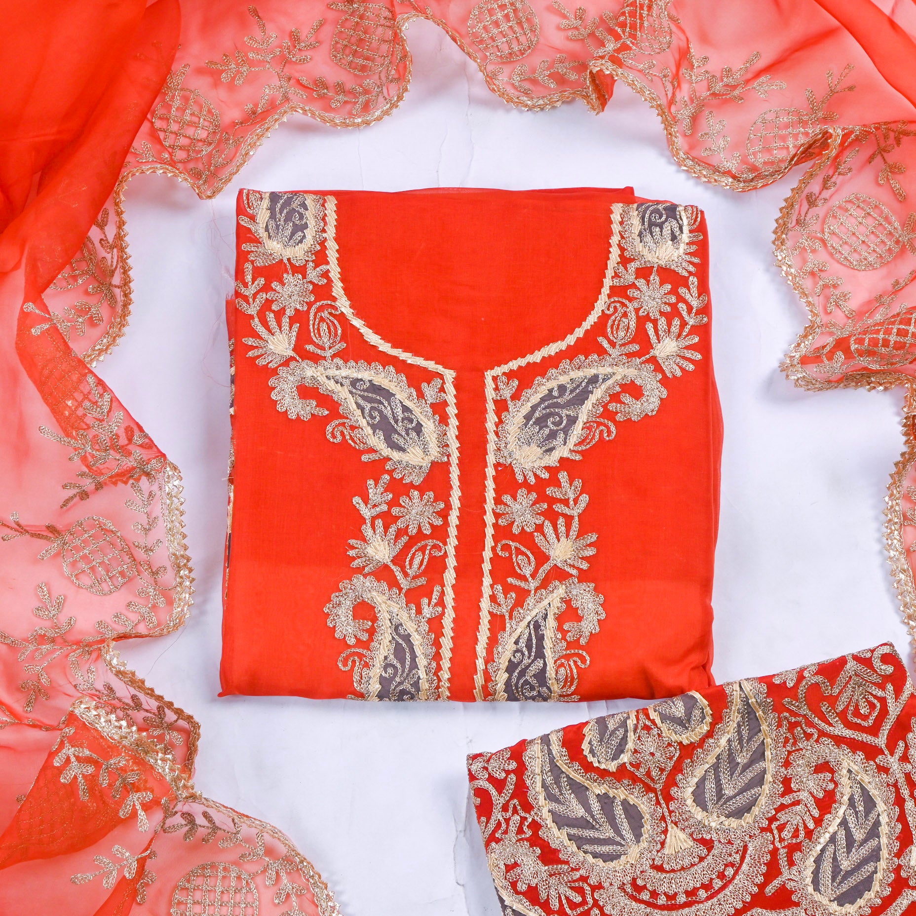 This Organza Orange Unstitched Suit, a timeless choice for those who appreciate refined craftsmanship. Crafted from premium organza fabric, this ensemble offers a luxurious drape and subtle sheen that catches light beautifully. The vibrant orange hue exudes confidence and elegance, making it perfect for festive occasions, celebrations, or formal gatherings. As an unstitched suit, it provides complete customization freedom—tailor it to your exact measurements and personal style preferences.