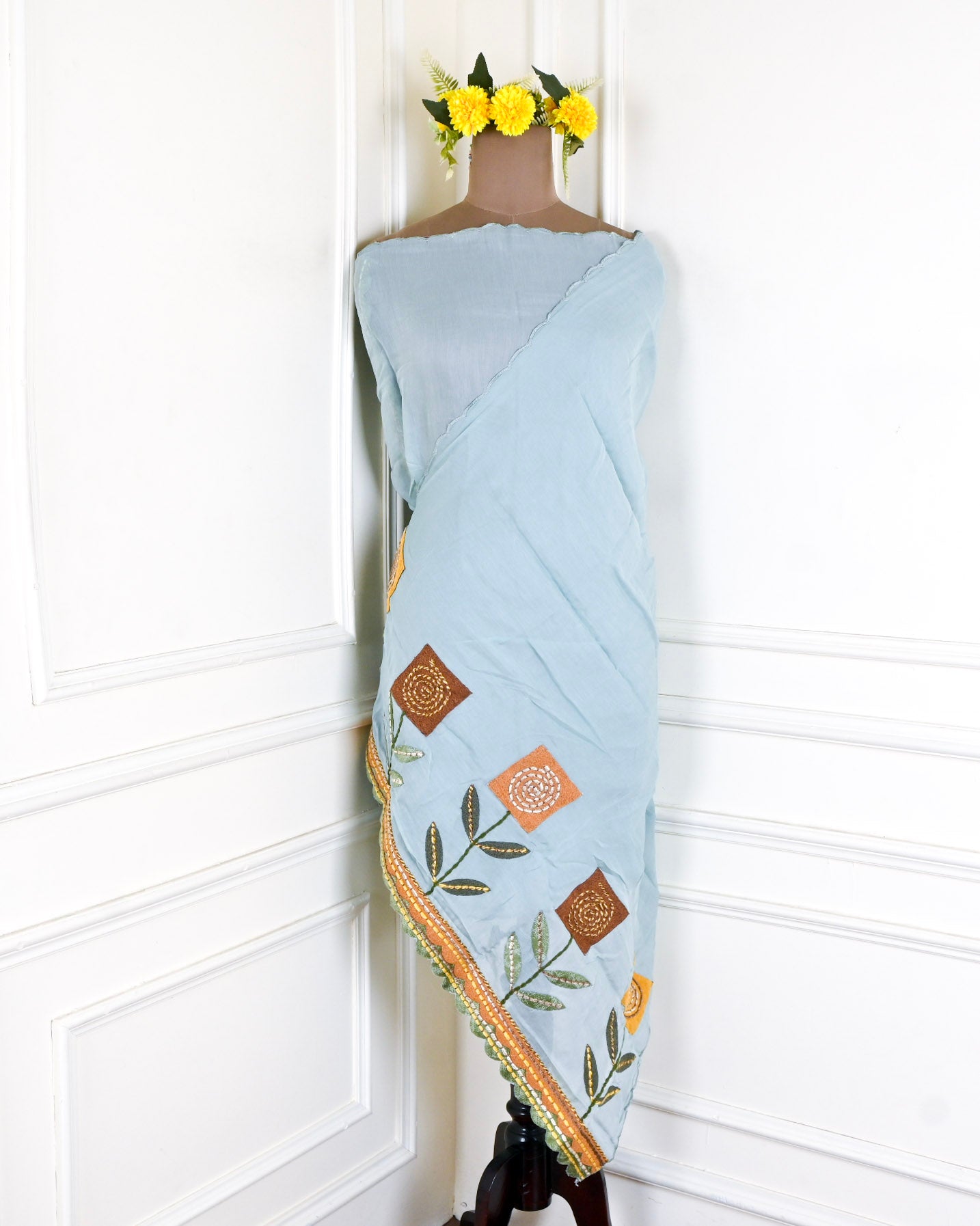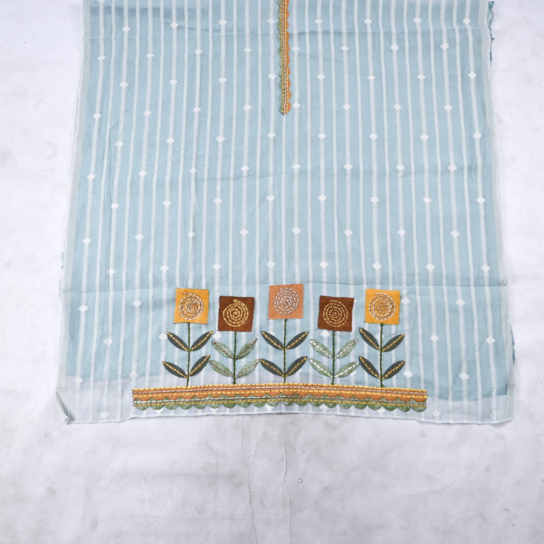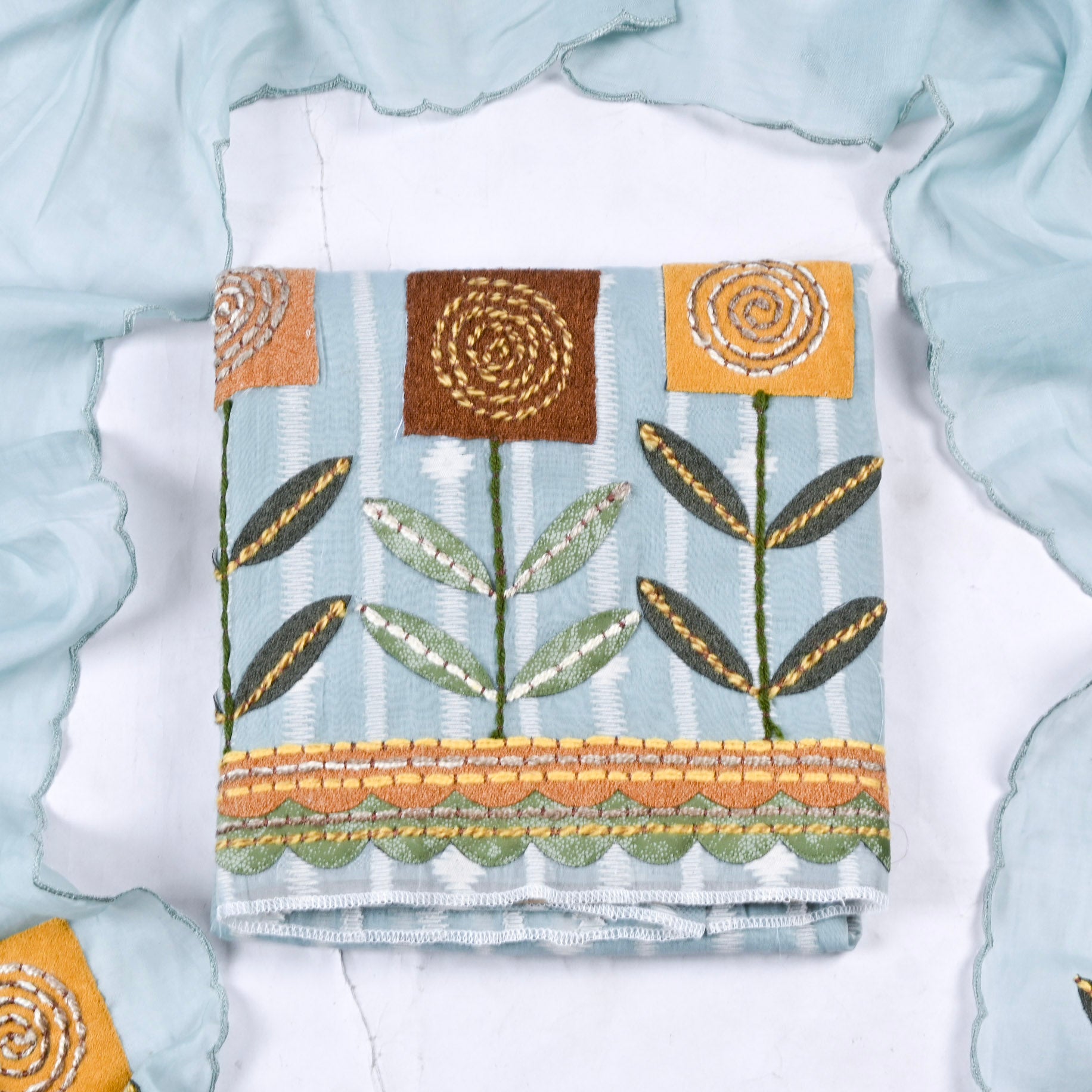 - Accompanied with an unstitched Muslin bottom and Mul Cotton dupatta.