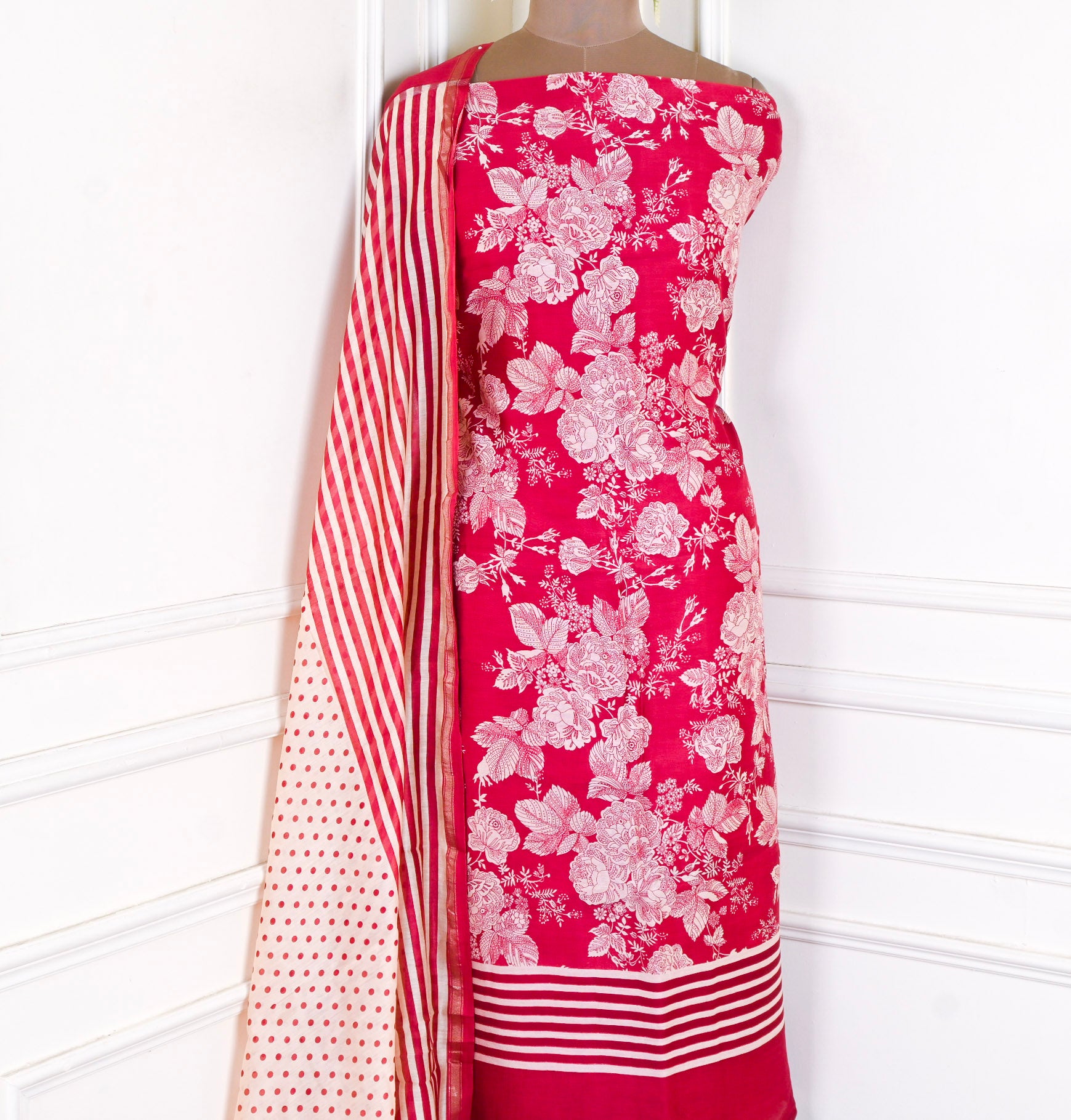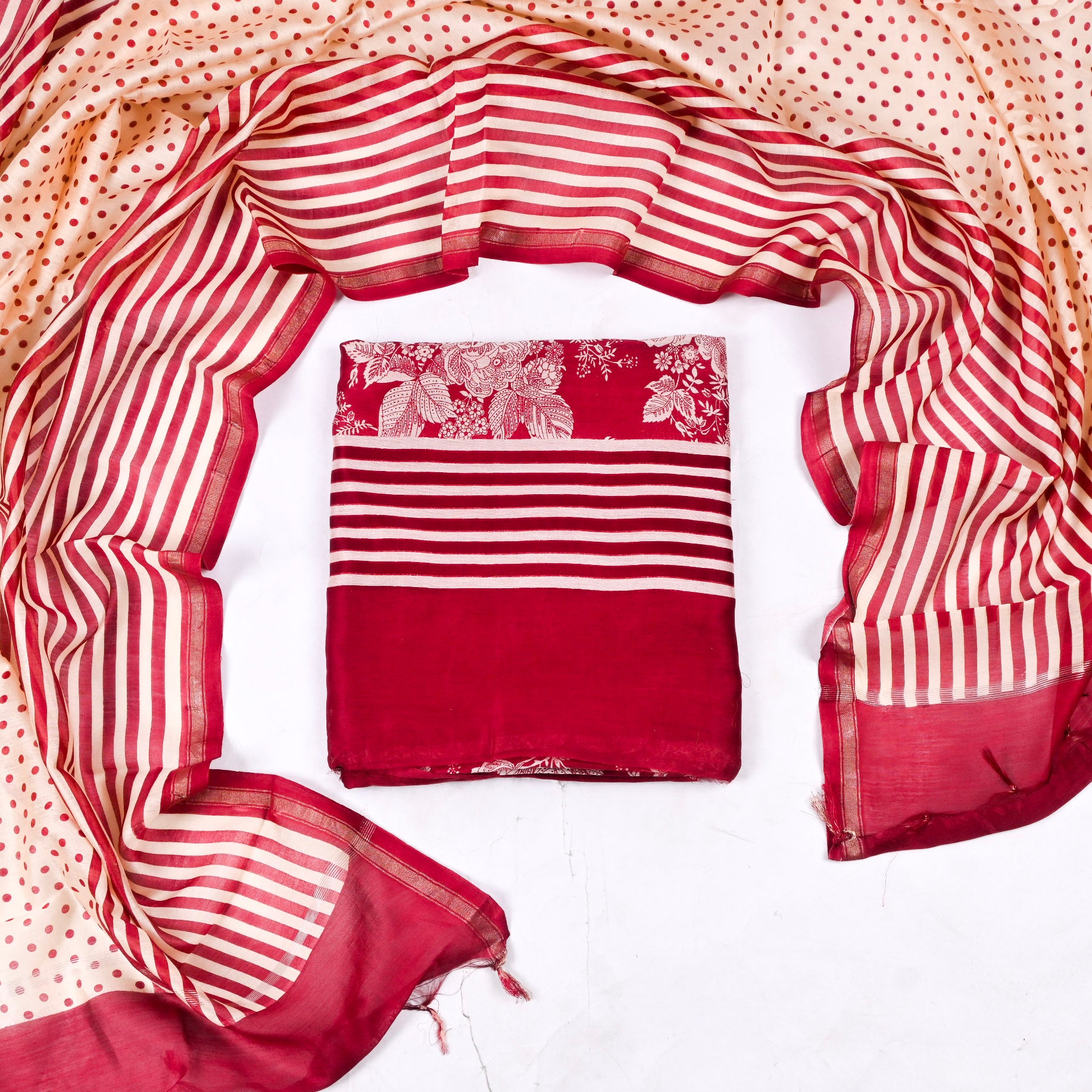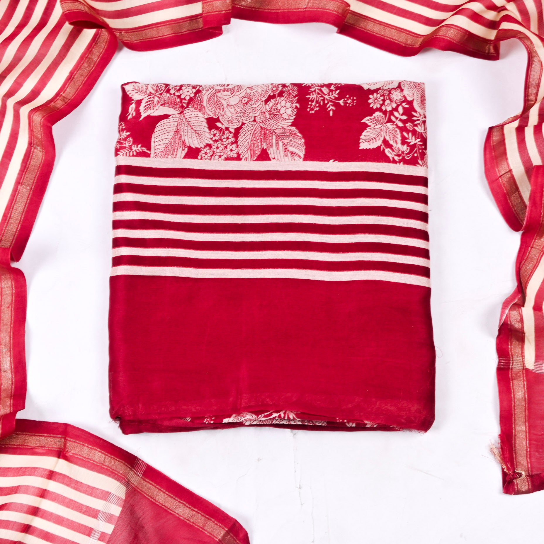 Maheshwari Cotton Red Unstitched Suit Crafted from premium maheshwari cotton, this unstitched suit offers the perfect foundation for custom tailoring. The soft, breathable fabric ensures comfort throughout the day, making it ideal for warm climates and everyday wear. The elegant red hue complements a variety of skin tones and styling preferences. As an unstitched piece, you have complete creative control over the fit and design—work with your tailor to achieve a silhouette that flatters your frame perfectly. Maheshwari cotton's natural durability means your suit will maintain its quality through multiple washes and seasons of wear.