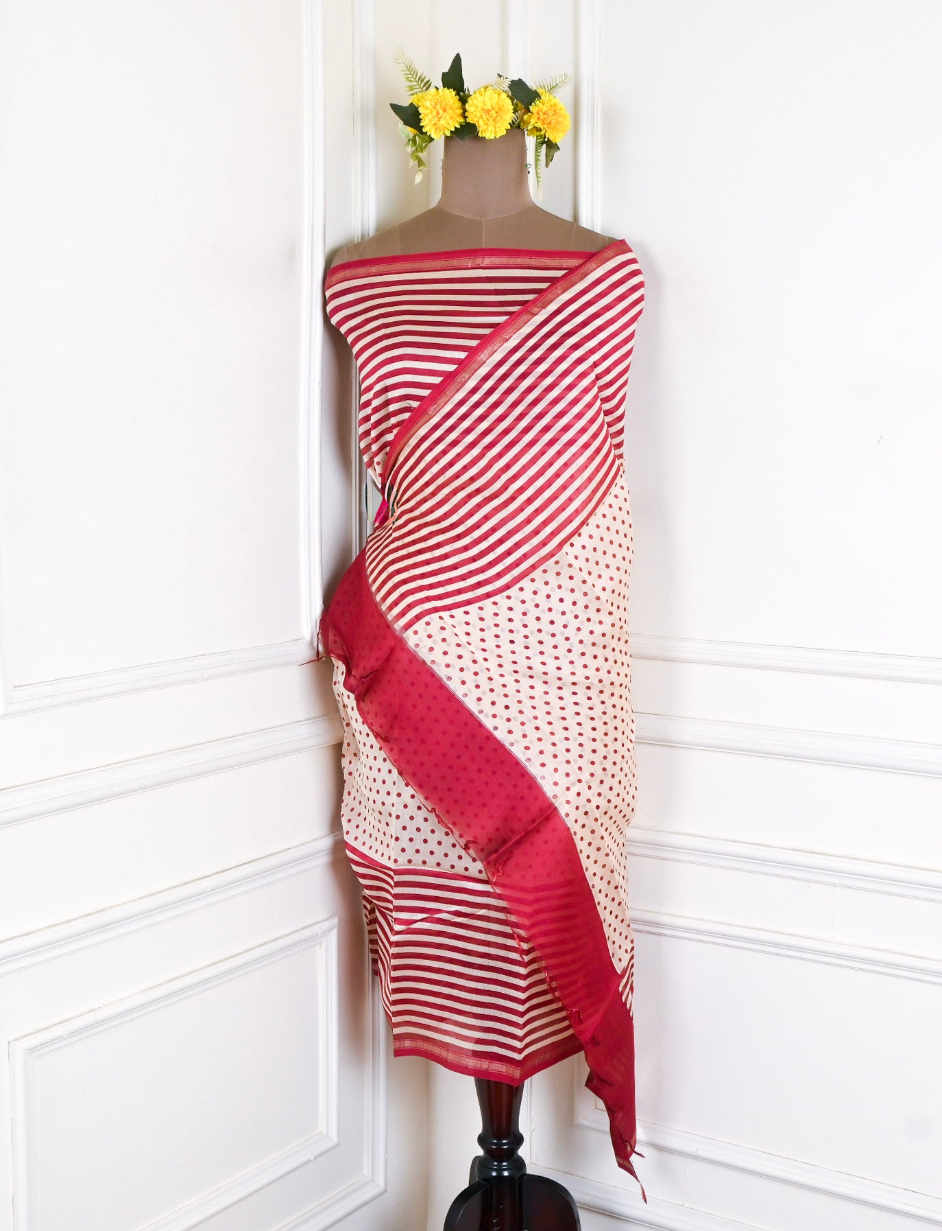 - Accompanied with an unstitched Maheshwari cotton bottom and Maheshwari Cotton dupatta.