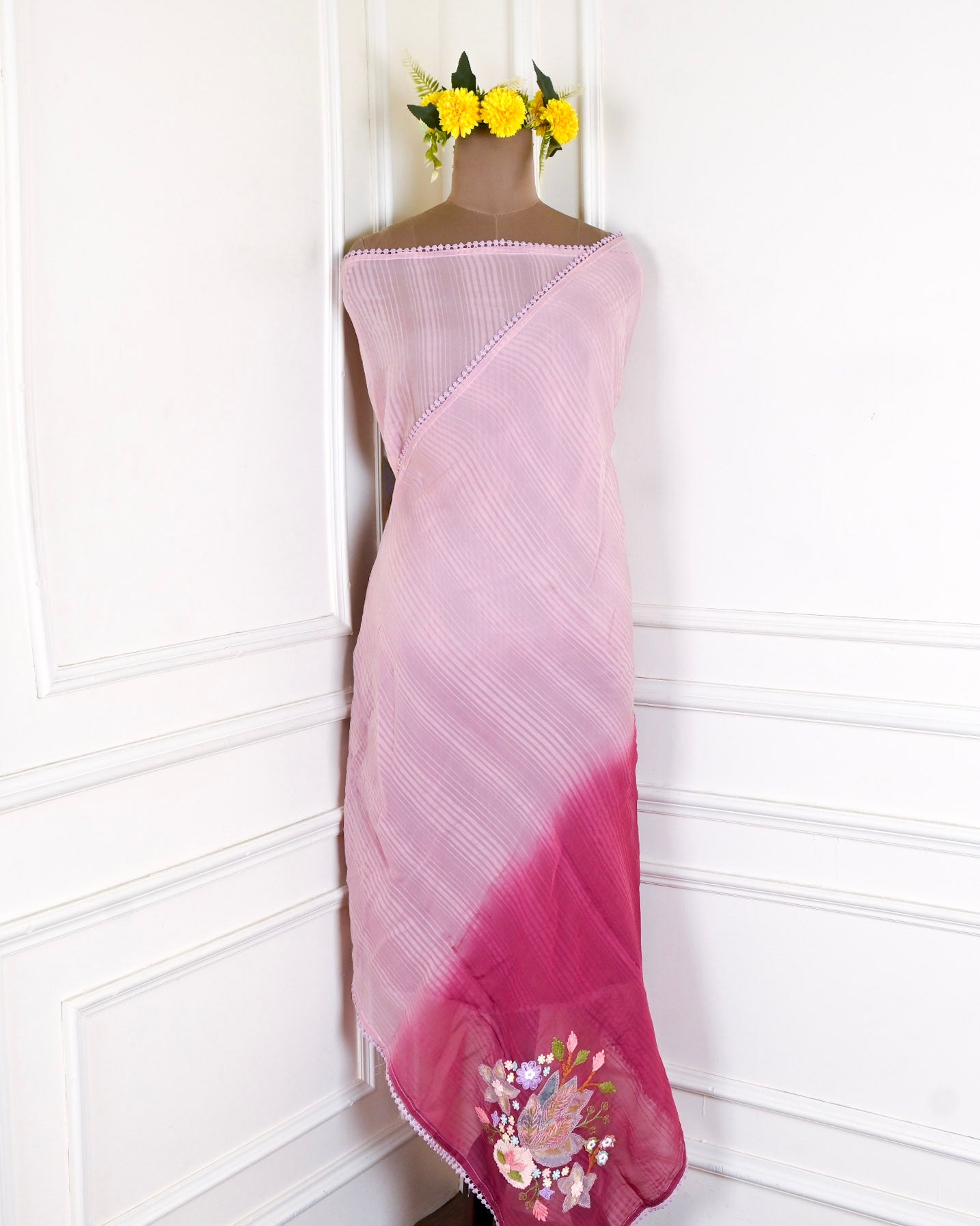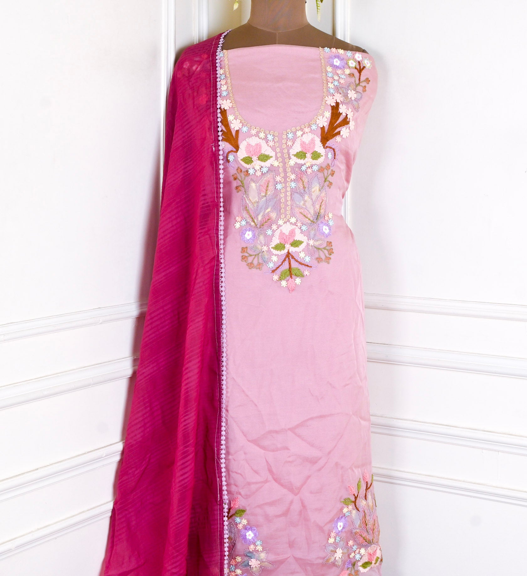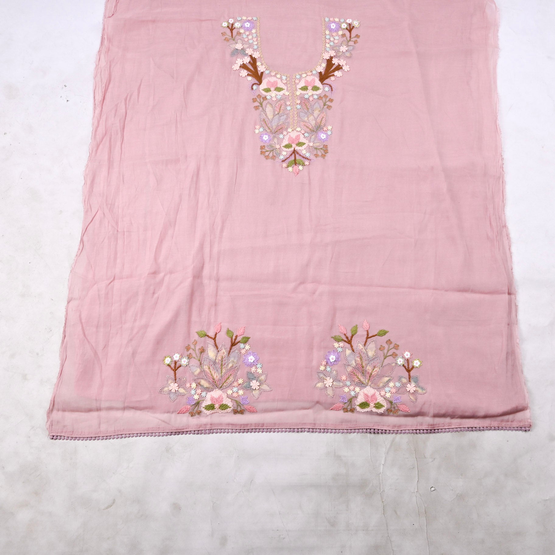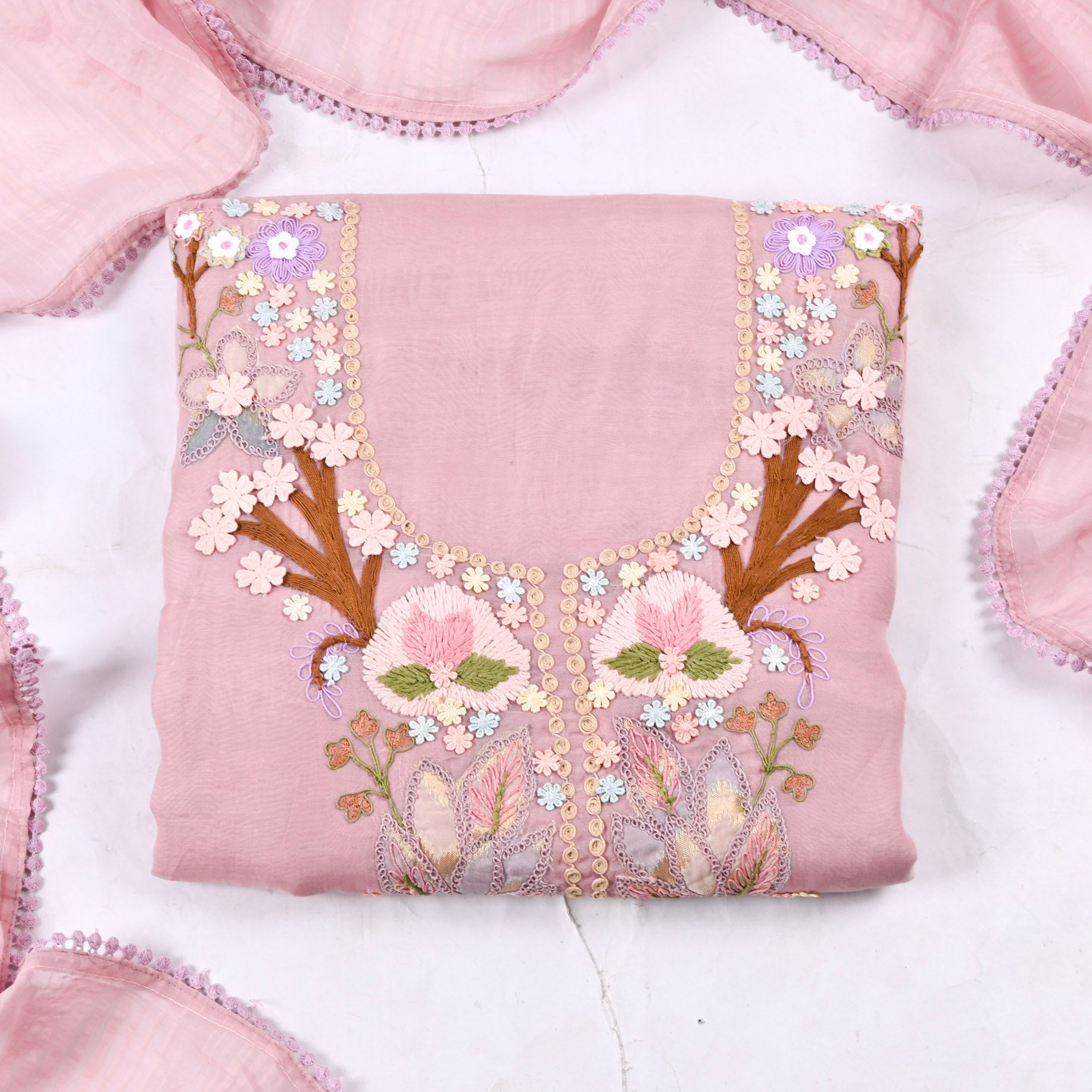 - Accompanied with an unstitched Muslin bottom and Mul dupatta.