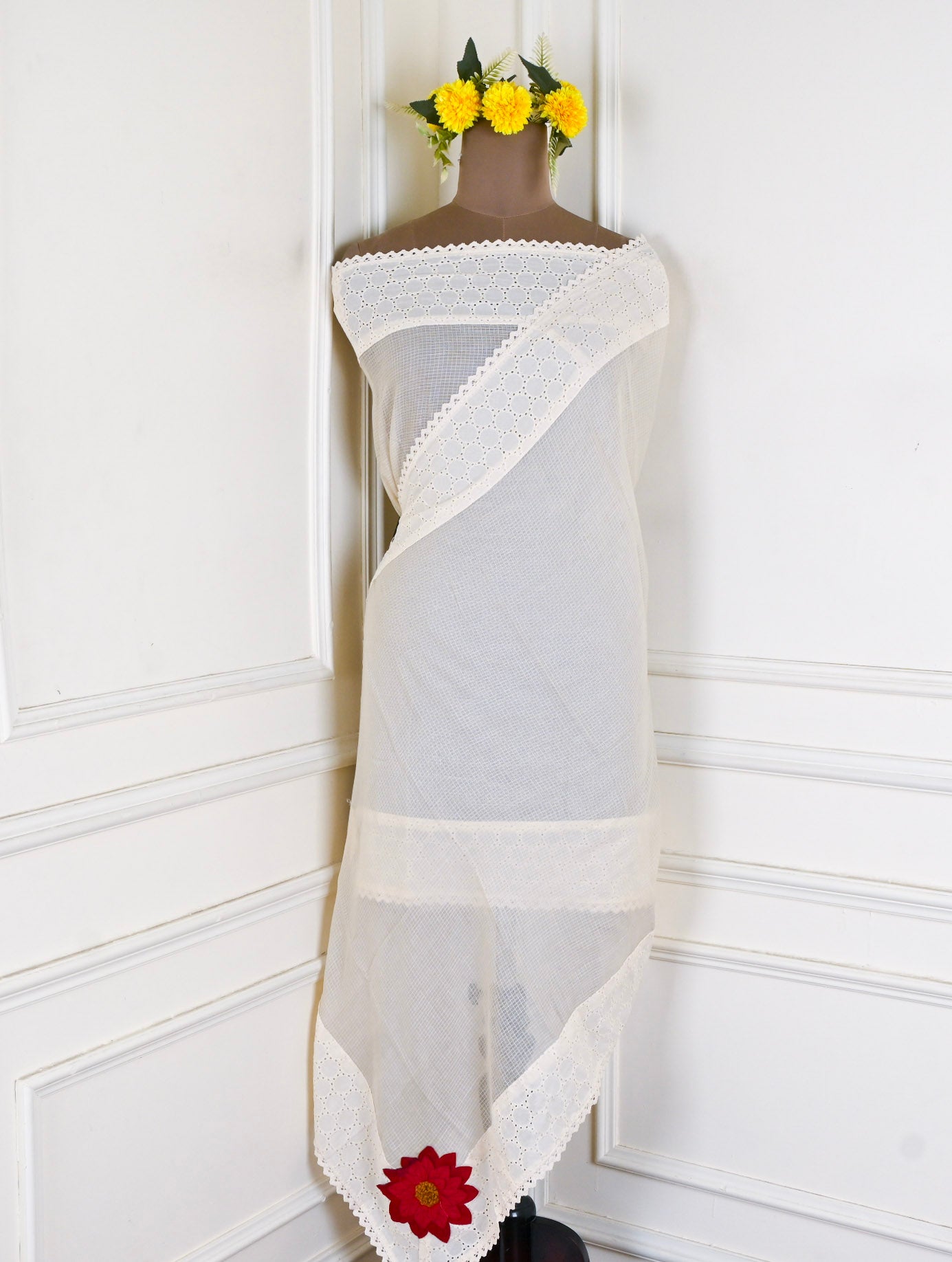 - Accompanied with an unstitched Muslin bottom and Kota Doria dupatta.