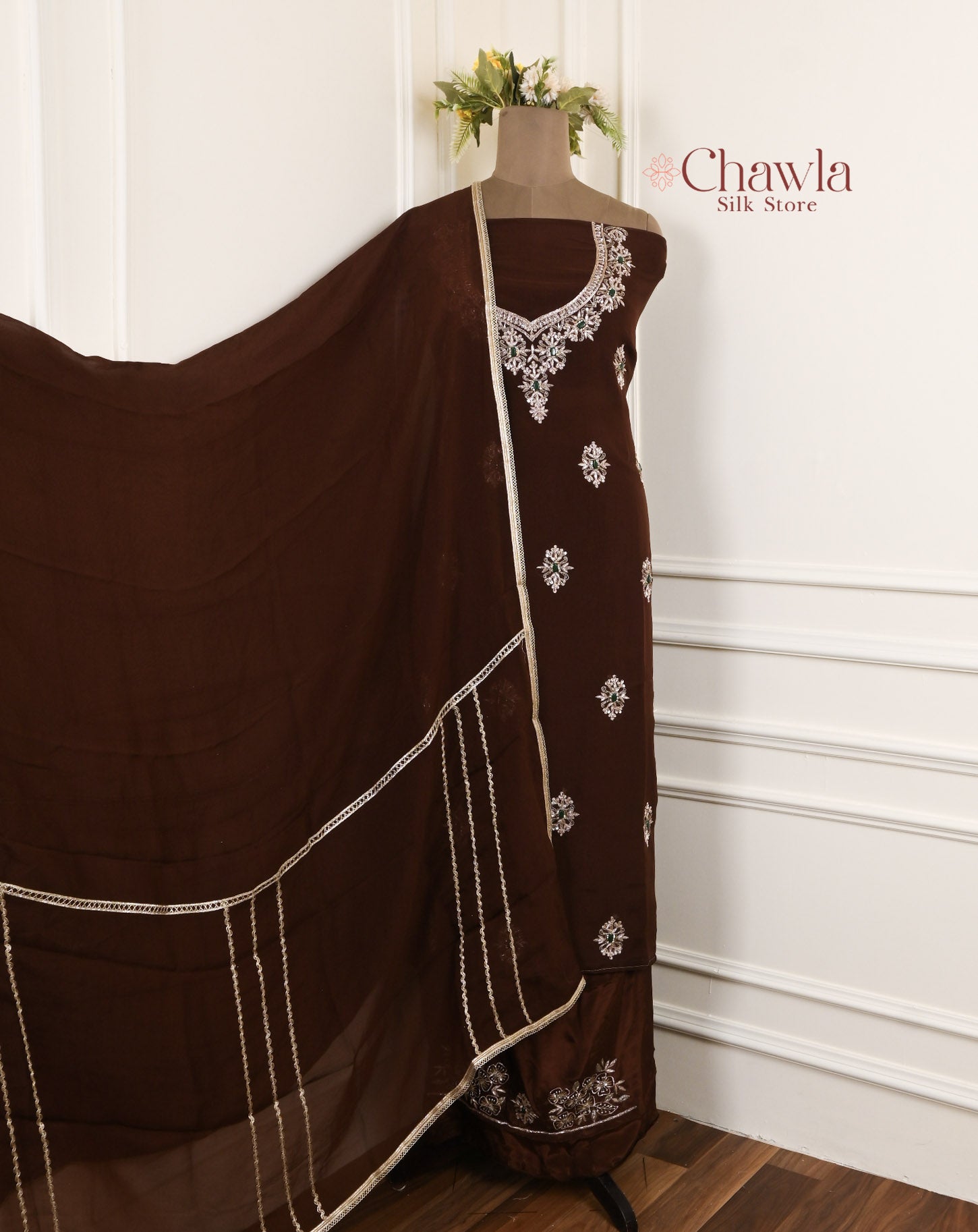 This Organza Brown Unstitched Suit features premium sheer organza fabric, prized for its lightweight and elegant texture. Designed for customization, it allows precise tailoring to achieve a perfect fit. The rich brown color adds a timeless sophistication, making it suitable for formal and festive occasions. Its breathable quality ensures comfort without compromising style, ideal for those who appreciate refined craftsmanship and personalized attire.
