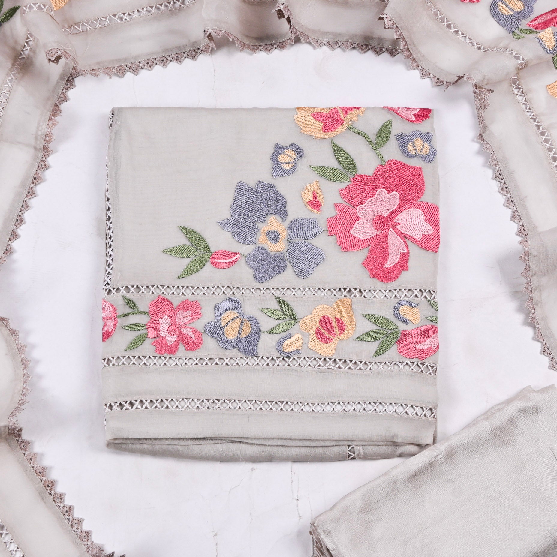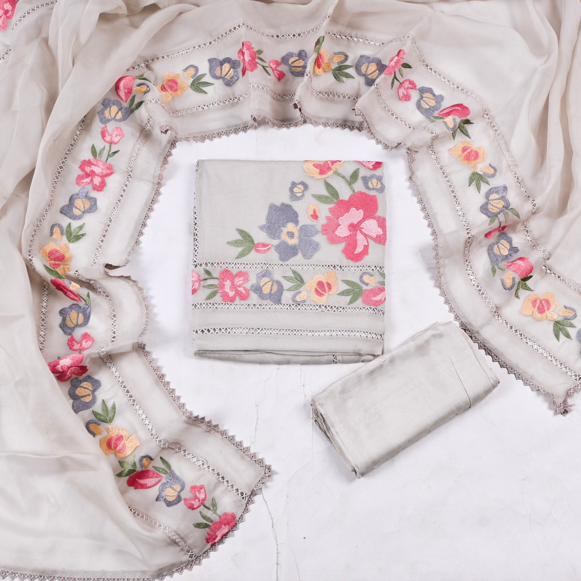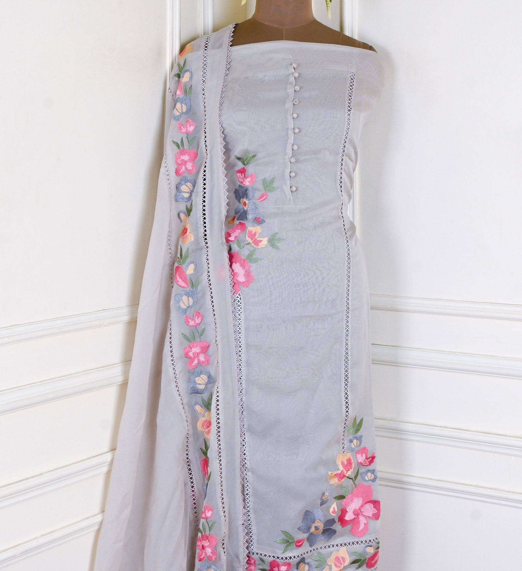 This Organza Grey Unstitched Suit from Chawla Silk Store. Crafted from premium Mul Cotton, this three-piece ensemble features intricate thread work and delicate detailing that speaks to timeless elegance. The set includes 2.5 meters of unstitched kurta fabric, 3 meters of Muslin bottom, and a 2.5-meter Mul dupatta perfect for customizing to your preferred fit and style. Ideal for special occasions or everyday sophistication, this suit promises premium quality and refined craftsmanship. Dry wash only to maintain its beauty.