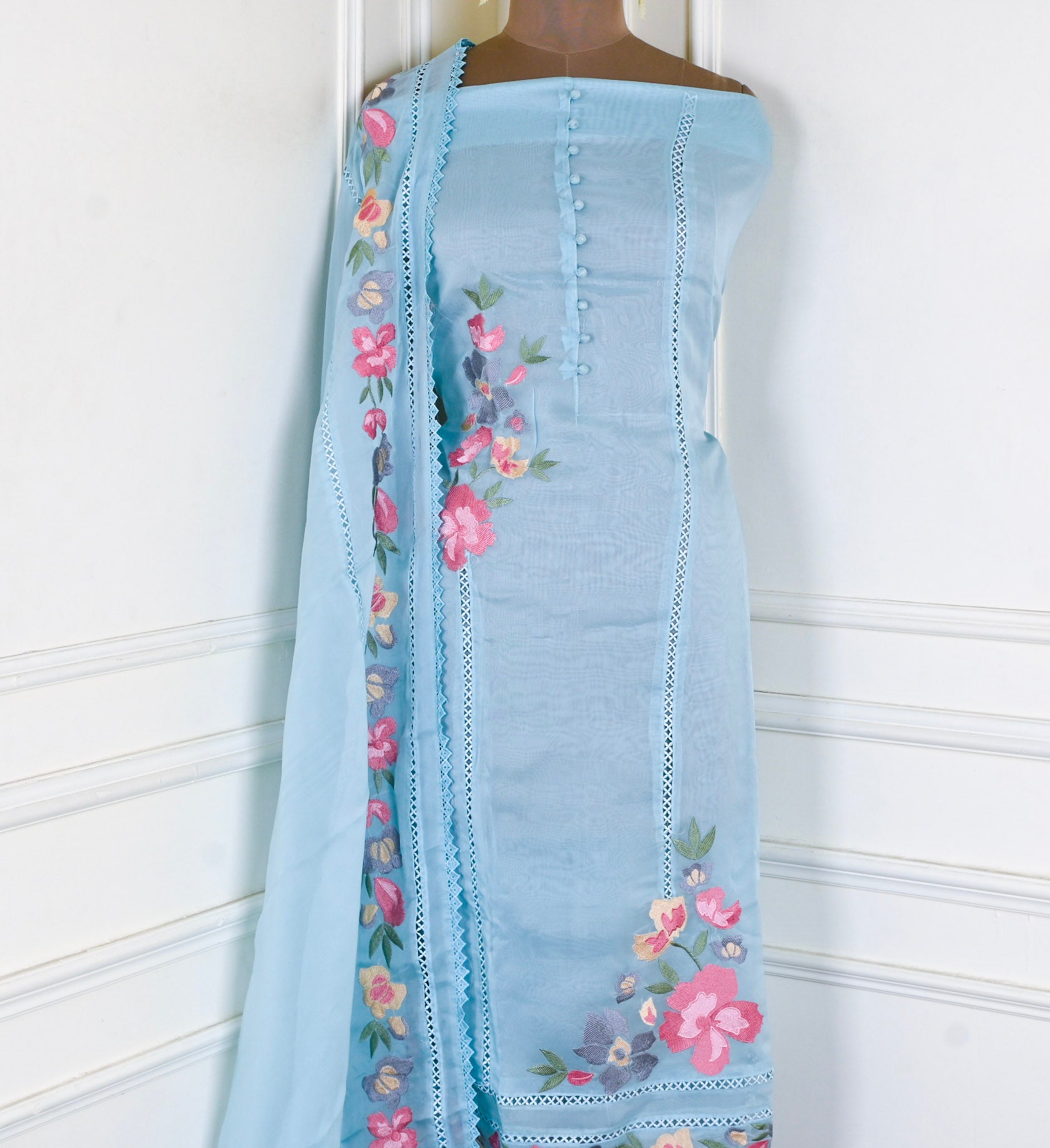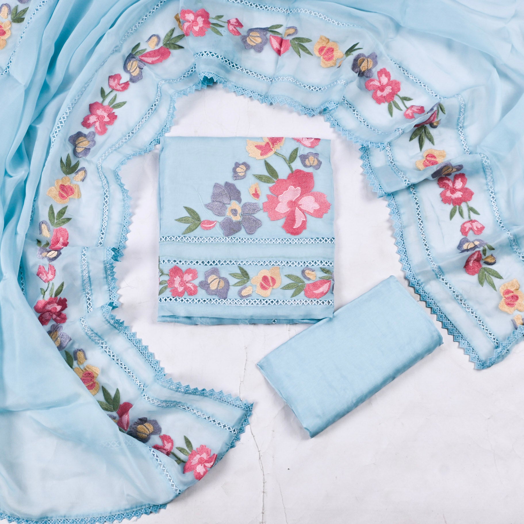 - Unstitched Suit in premium Organza fabric.