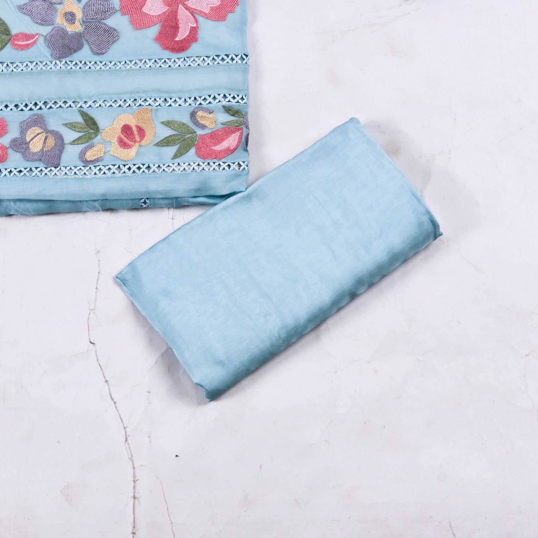 This Organza Ferozi Unstitched Suit from Chawla Silk Store. Crafted from premium Mul Cotton, this three-piece ensemble features intricate thread work and delicate detailing that speaks to timeless elegance. The set includes 2.5 meters of unstitched kurta fabric, 3 meters of Muslin bottom, and a 2.5-meter Mul dupatta perfect for customizing to your preferred fit and style. Ideal for special occasions or everyday sophistication, this suit promises premium quality and refined craftsmanship. Dry wash only to maintain its beauty.