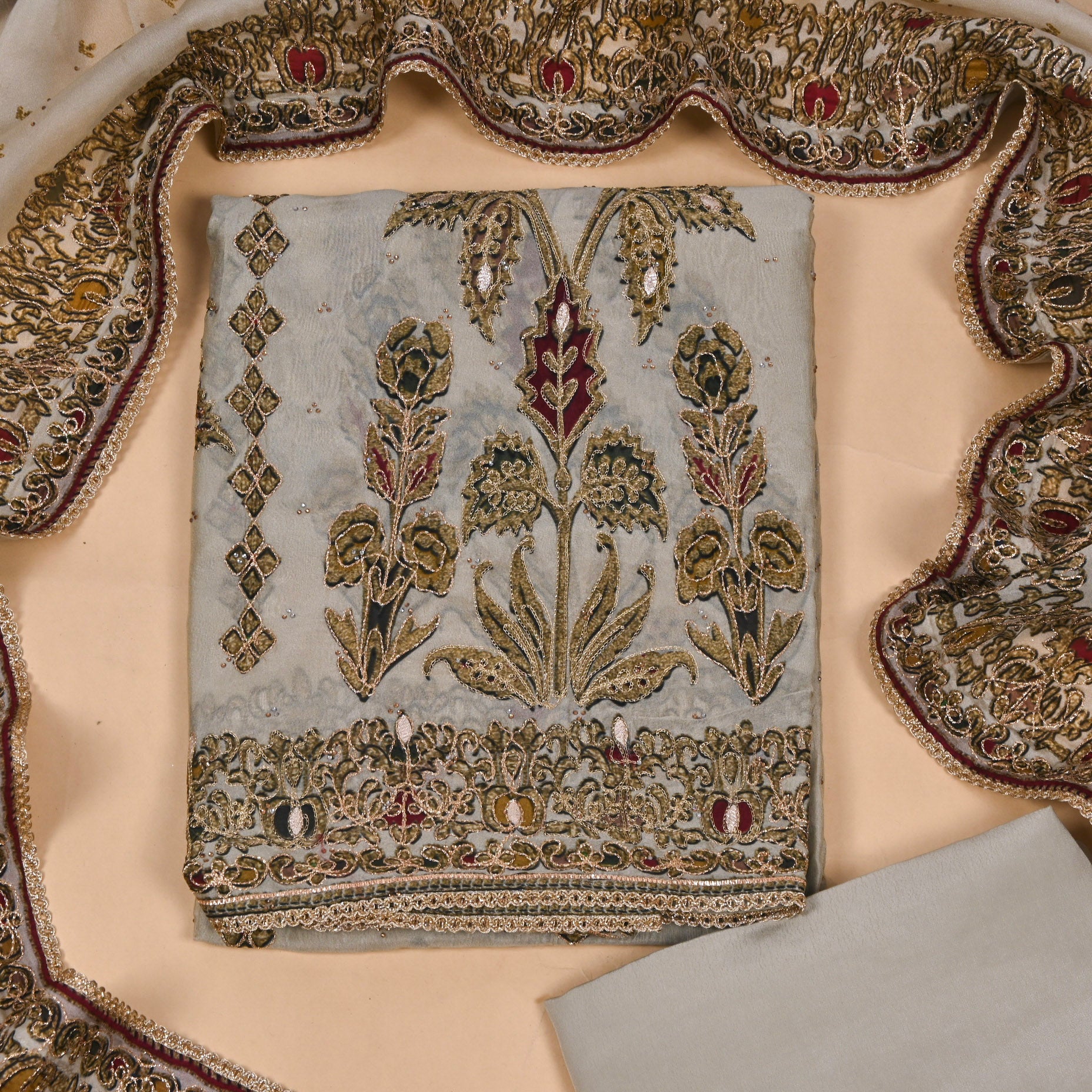 - Accompanied with an unstitched Crepe bottom and Organza dupatta.