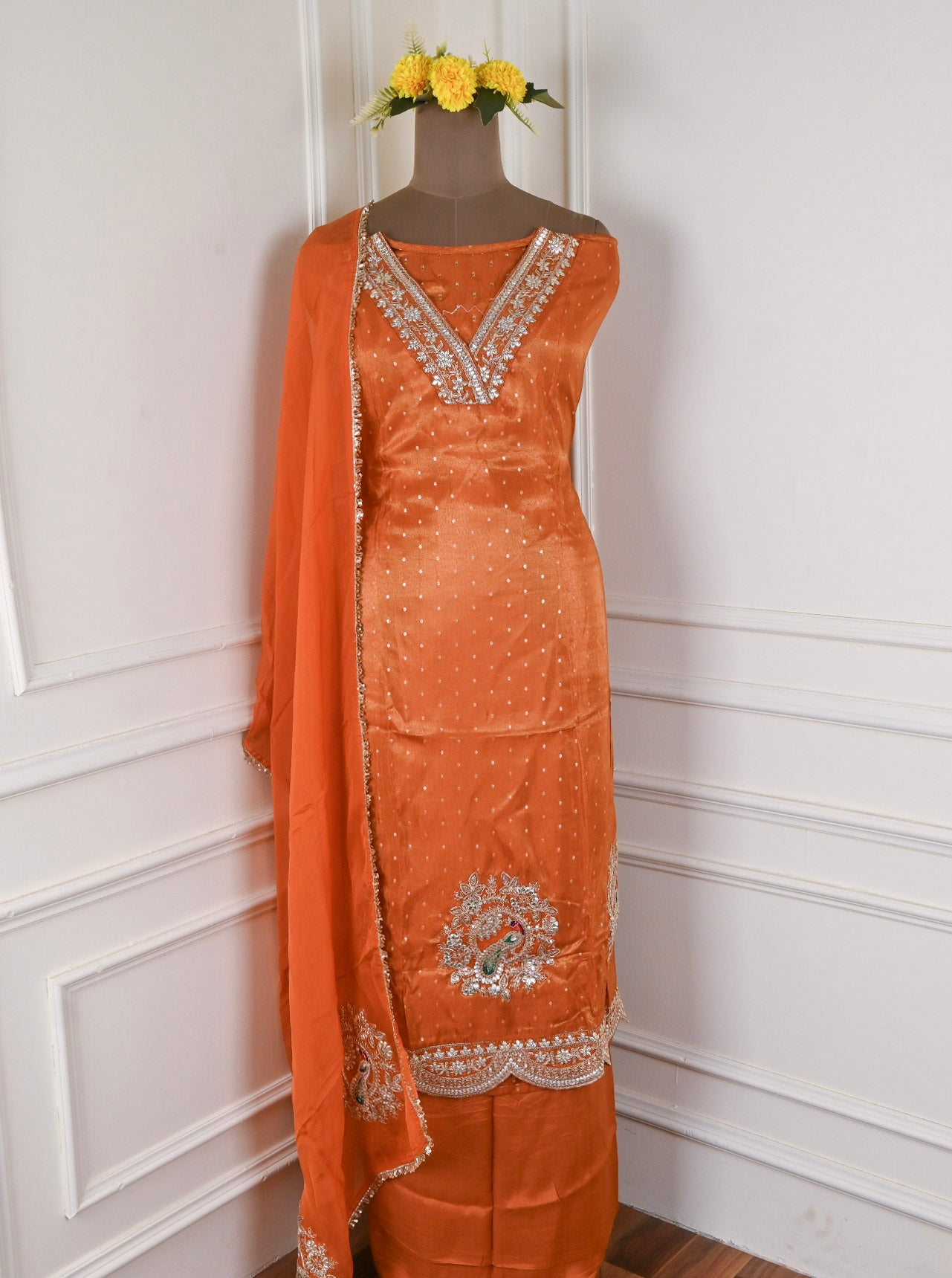The Banarasi Orange Unstitched Suit combines rich heritage with modern flexibility. Crafted from vibrant orange Banarasi fabric, it allows you to tailor a custom fit that flatters your style and comfort preferences. Perfect for traditional events and special occasions, this suit supports your desire for elegance and timeless beauty.