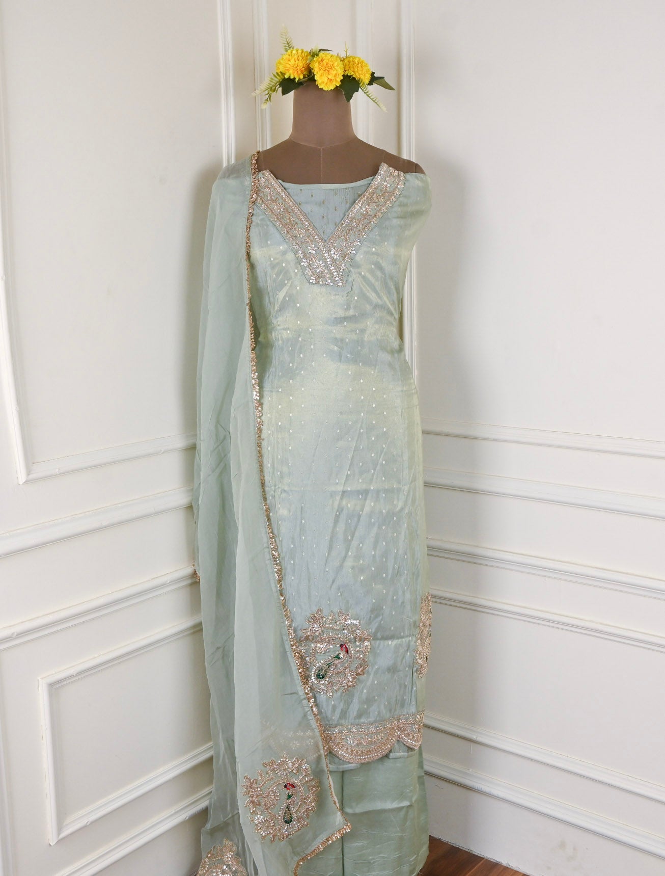 - Accompanied with an unstitched Muslin bottom and Organza dupatta.
