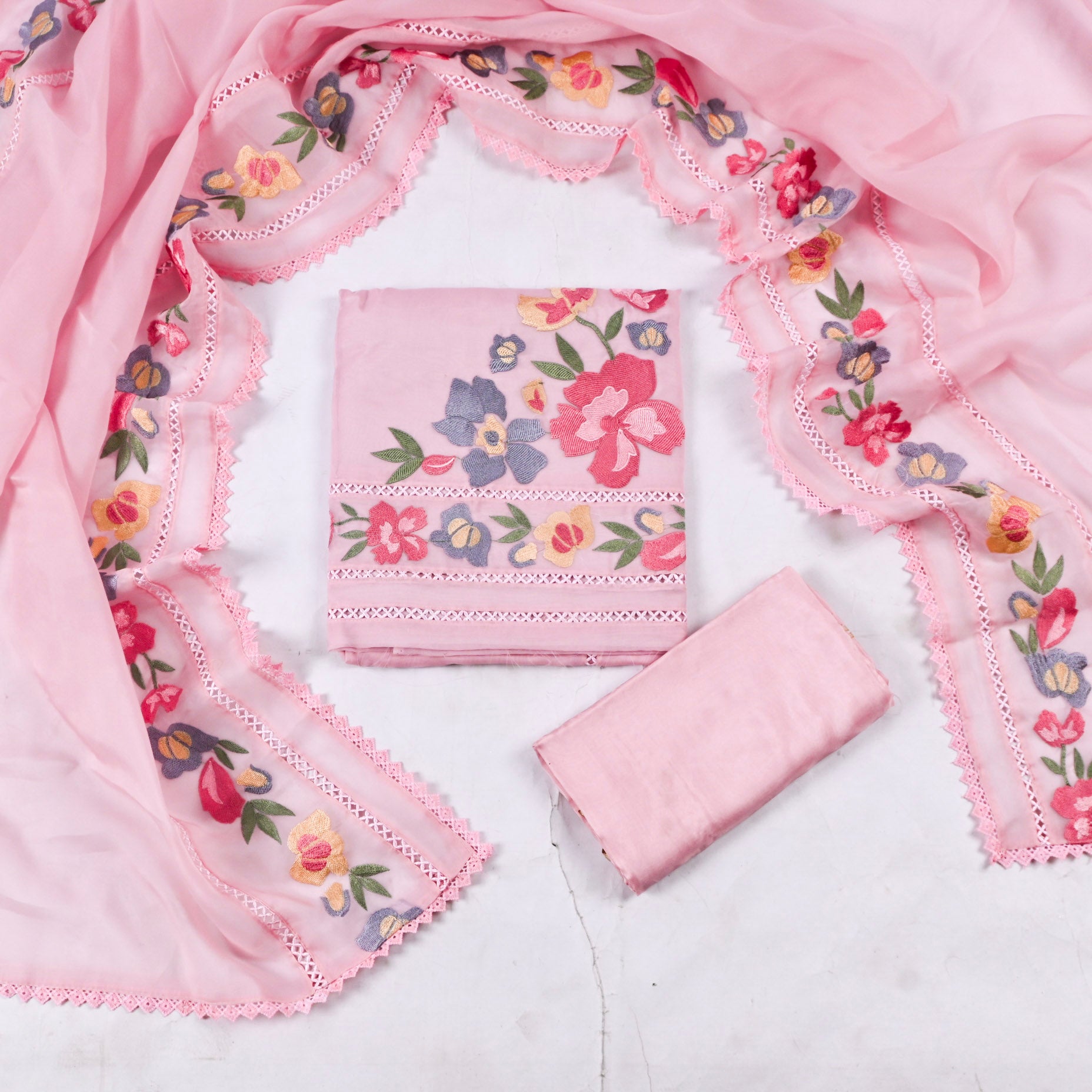 This Organza Pink Unstitched Suit from Chawla Silk Store. Crafted from premium Mul Cotton, this three-piece ensemble features intricate thread work and delicate detailing that speaks to timeless elegance. The set includes 2.5 meters of unstitched kurta fabric, 3 meters of Muslin bottom, and a 2.5-meter Mul dupatta perfect for customizing to your preferred fit and style. Ideal for special occasions or everyday sophistication, this suit promises premium quality and refined craftsmanship. Dry wash only to maintain its beauty.