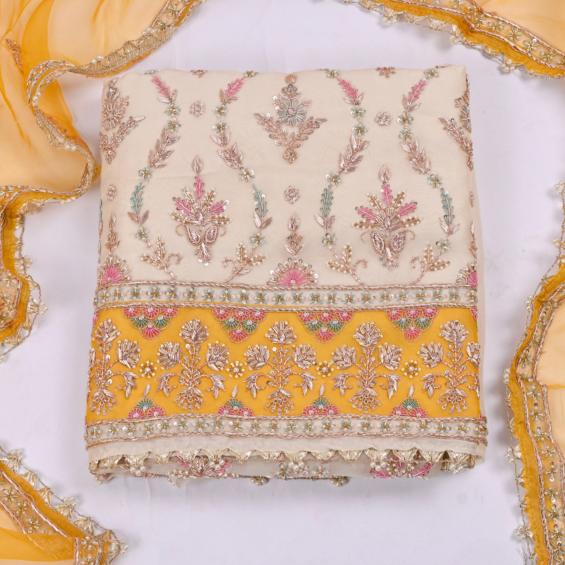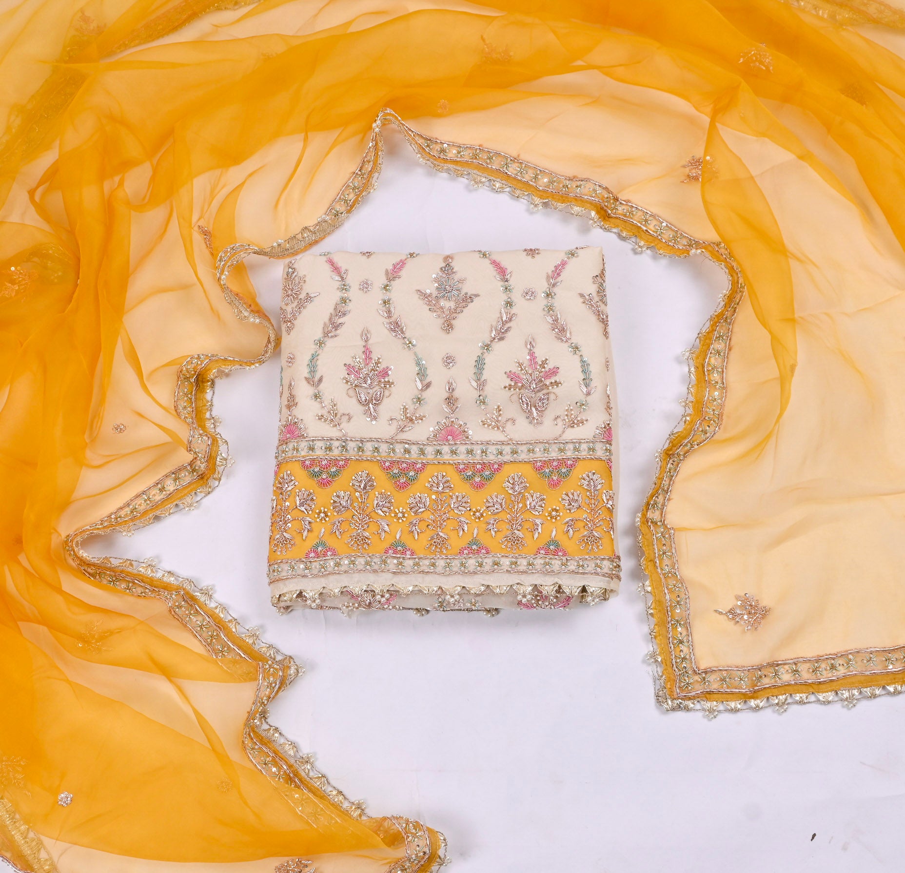 - Accompanied with an unstitched Crepe bottom and Organza dupatta.