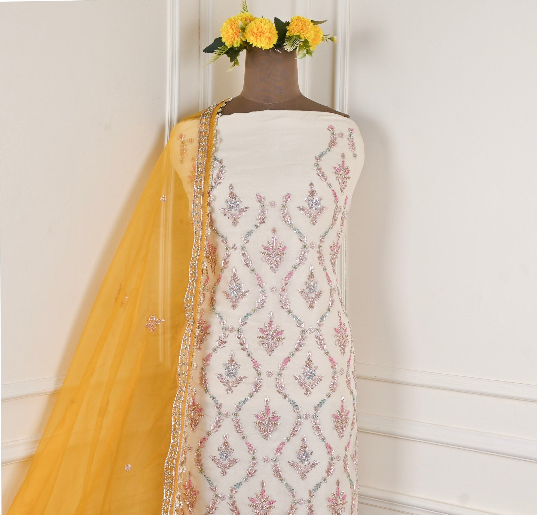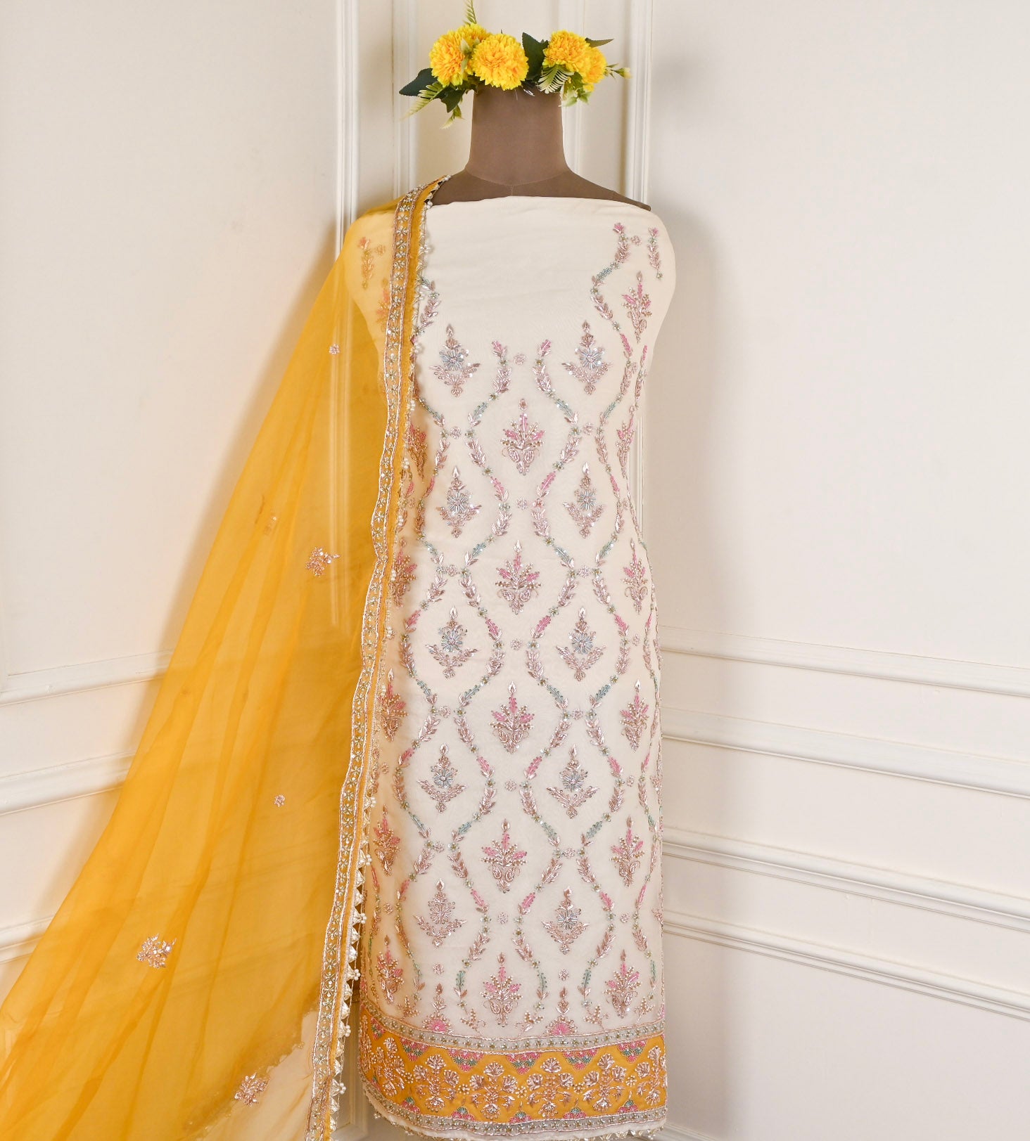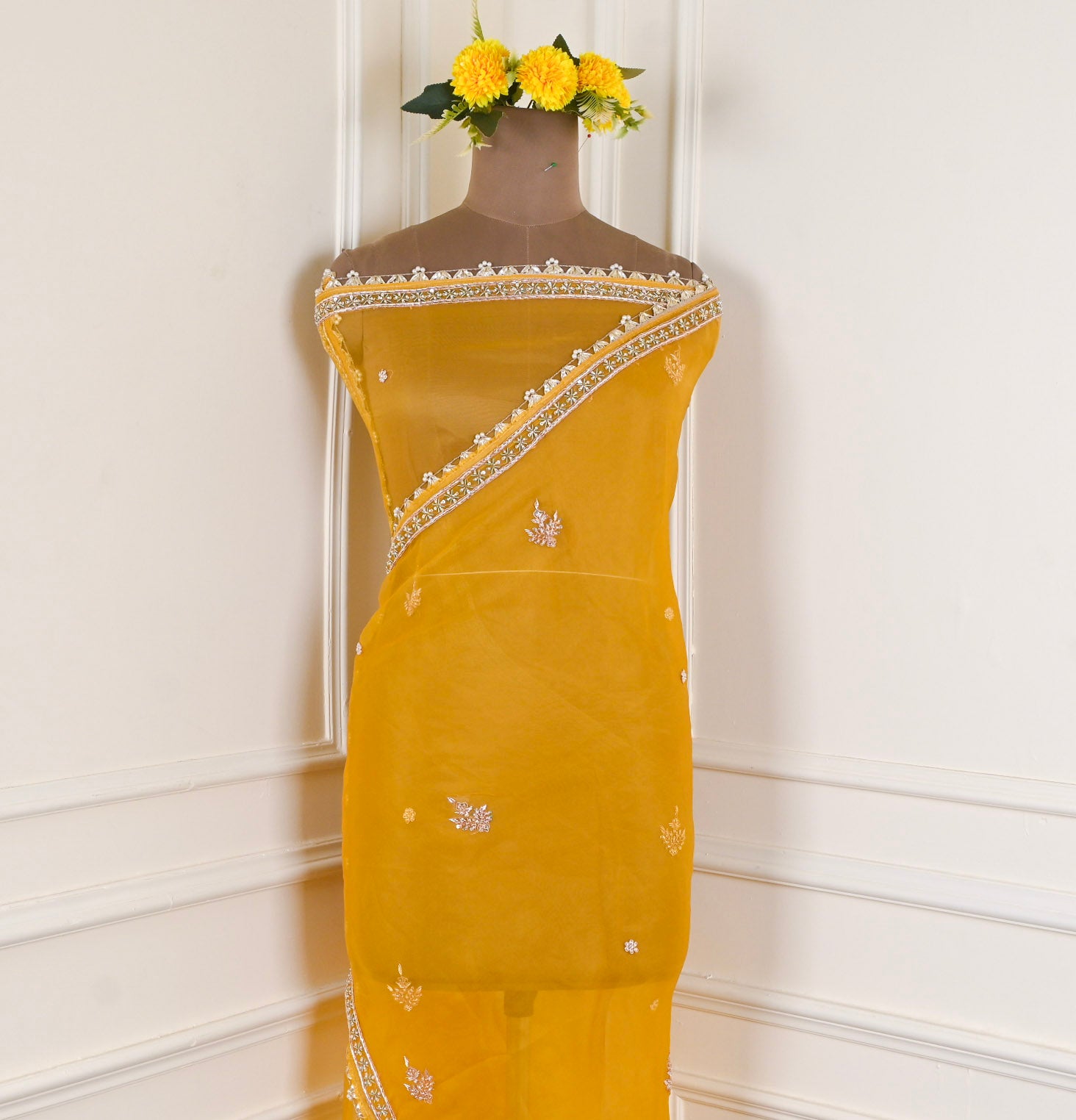 This Organza Yellow Unstitched Suit features premium organza fabric known for its sheer, lightweight texture and subtle sheen. The soft yellow shade offers a sophisticated palette suitable for a variety of occasions. Being unstitched, it provides the flexibility to tailor the suit according to your measurements and desired style, ensuring a tailored fit and personalized design. Ideal for those who appreciate quality materials and expert customization in traditional attire.