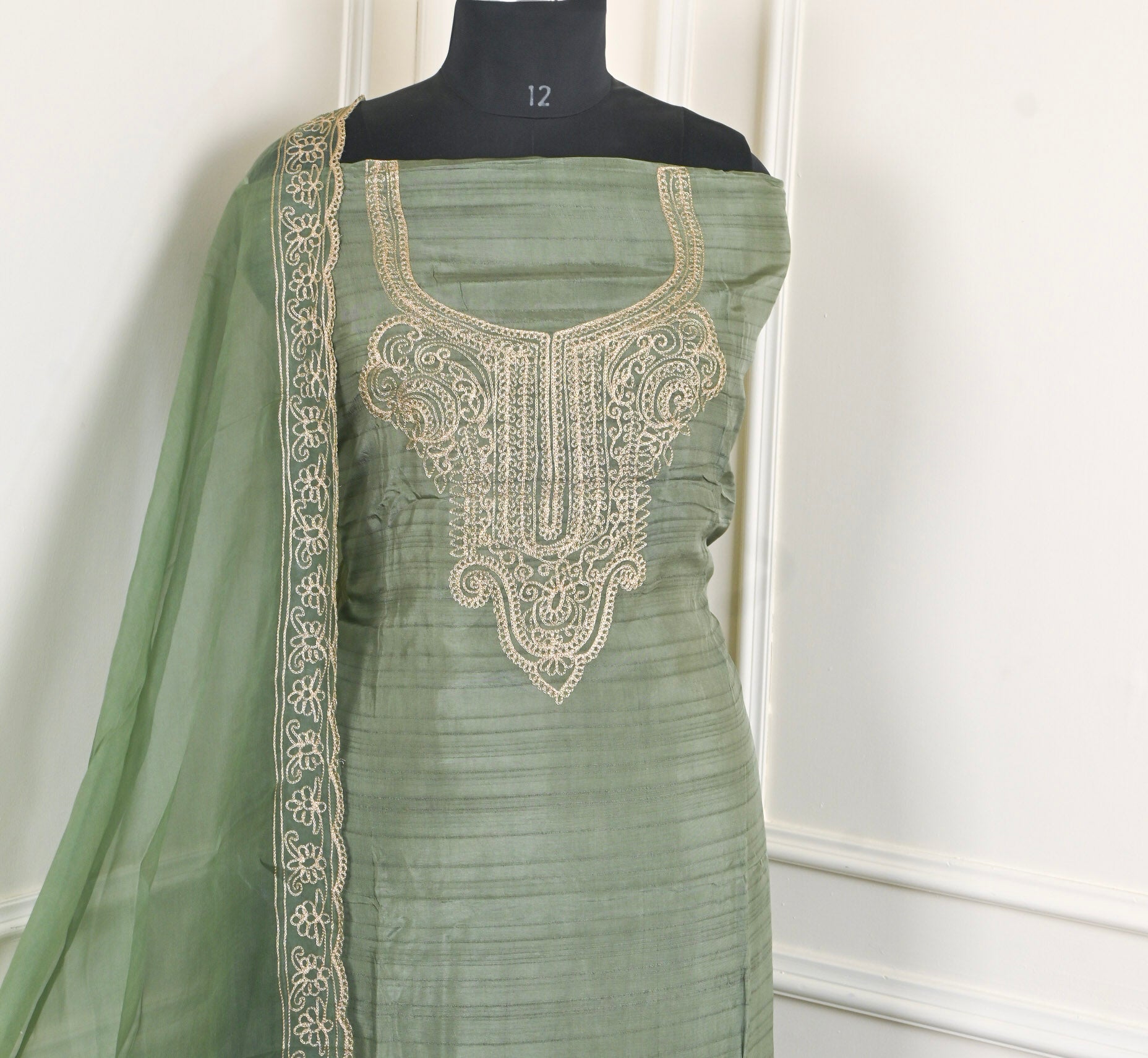 This Raw Silk Sea Green Unstitched Suit features high-quality raw silk fabric, prized for its natural texture and elegant sheen. The unstitched format allows for custom tailoring, ensuring a precise fit tailored to your preferences. Its soothing sea green color offers a sophisticated and versatile option for formal events and traditional occasions, combining timeless fabric with personalized craftsmanship.