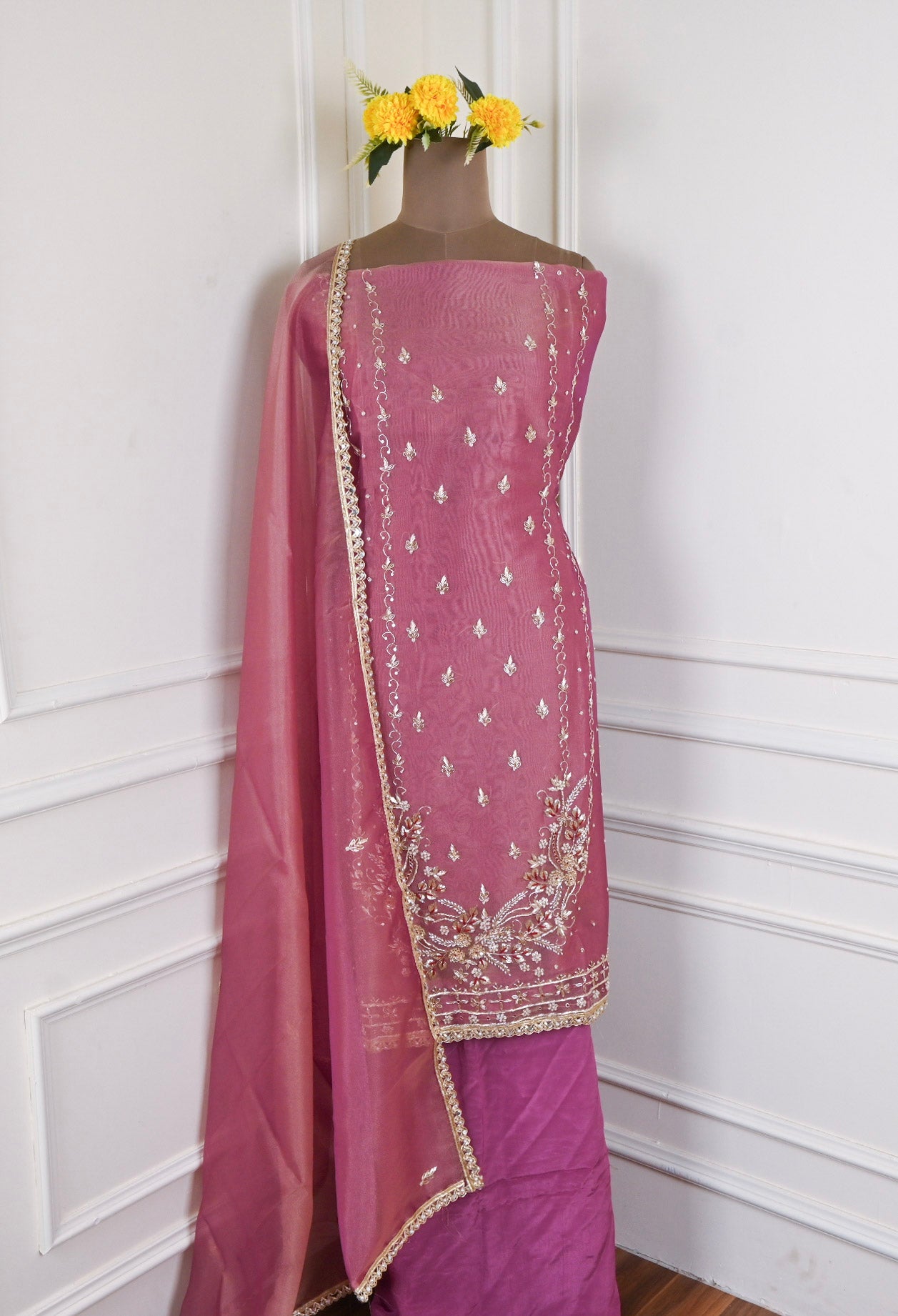 - Accompanied with an unstitched Crepe bottom and Shimmer dupatta.