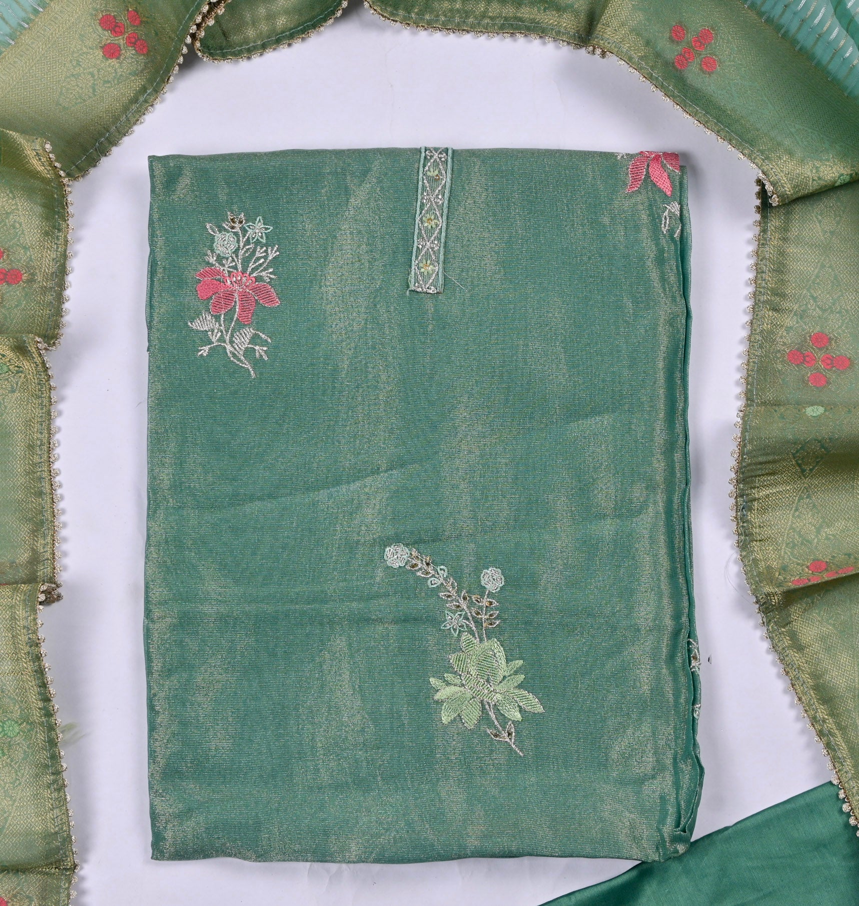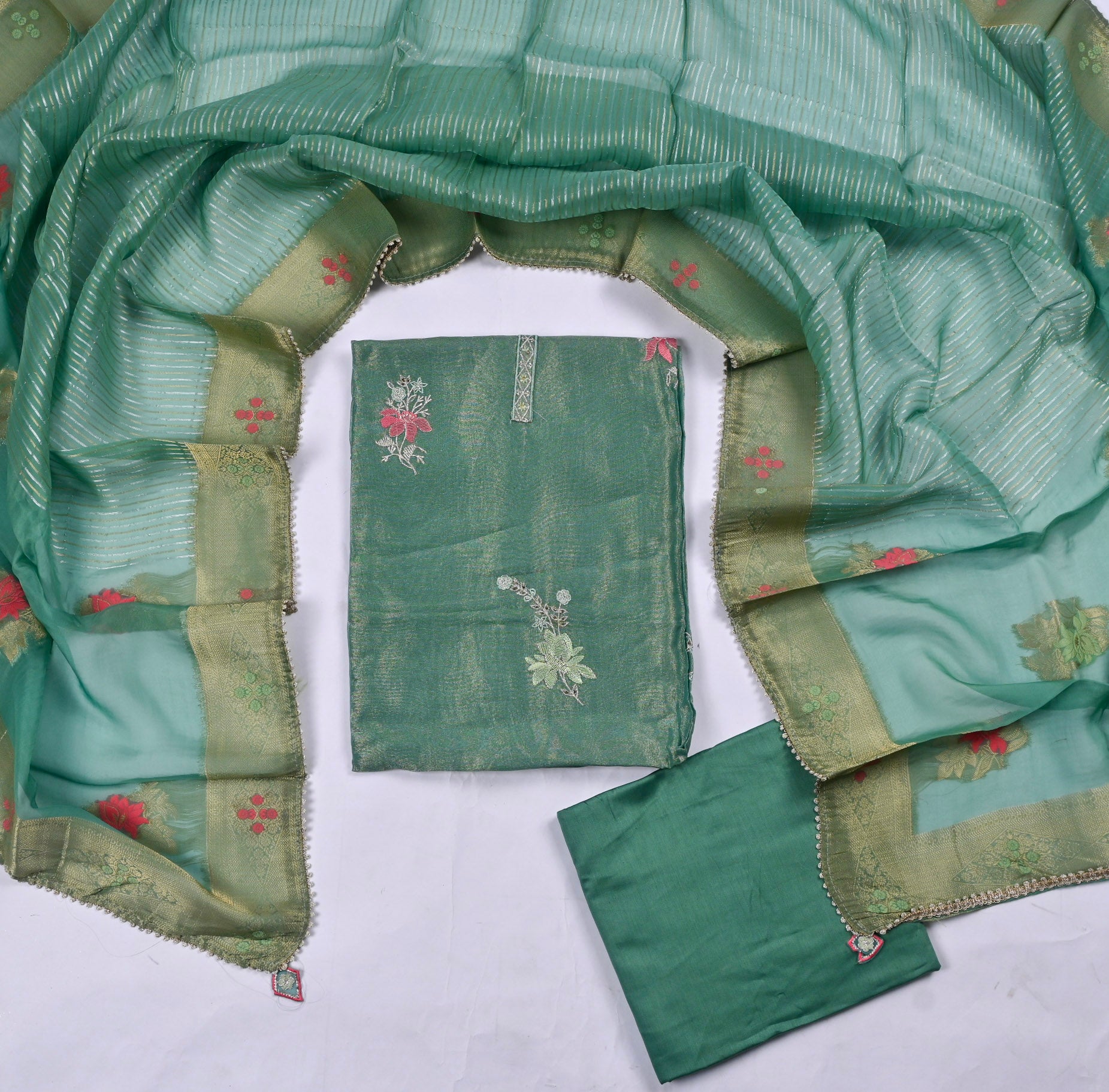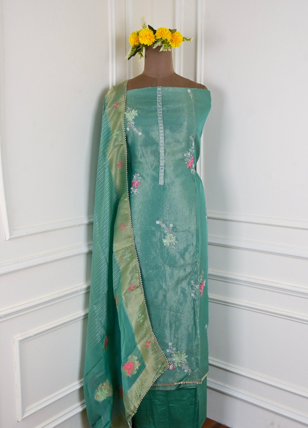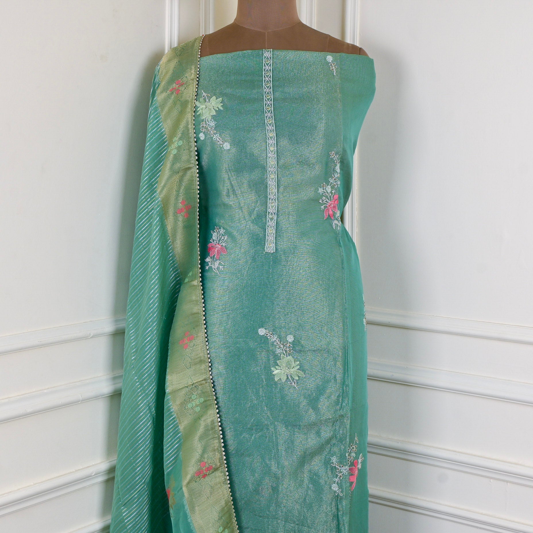 The Shimmer Green Unstitched Suit combines luxurious fabric with a subtle sheen to create a sophisticated base for personalized tailoring. Its vibrant green tone adds a striking yet elegant touch, perfect for crafting a look suited to festive events or formal occasions. This unstitched ensemble provides the flexibility to achieve a precise fit and design that matches your individual style preferences.