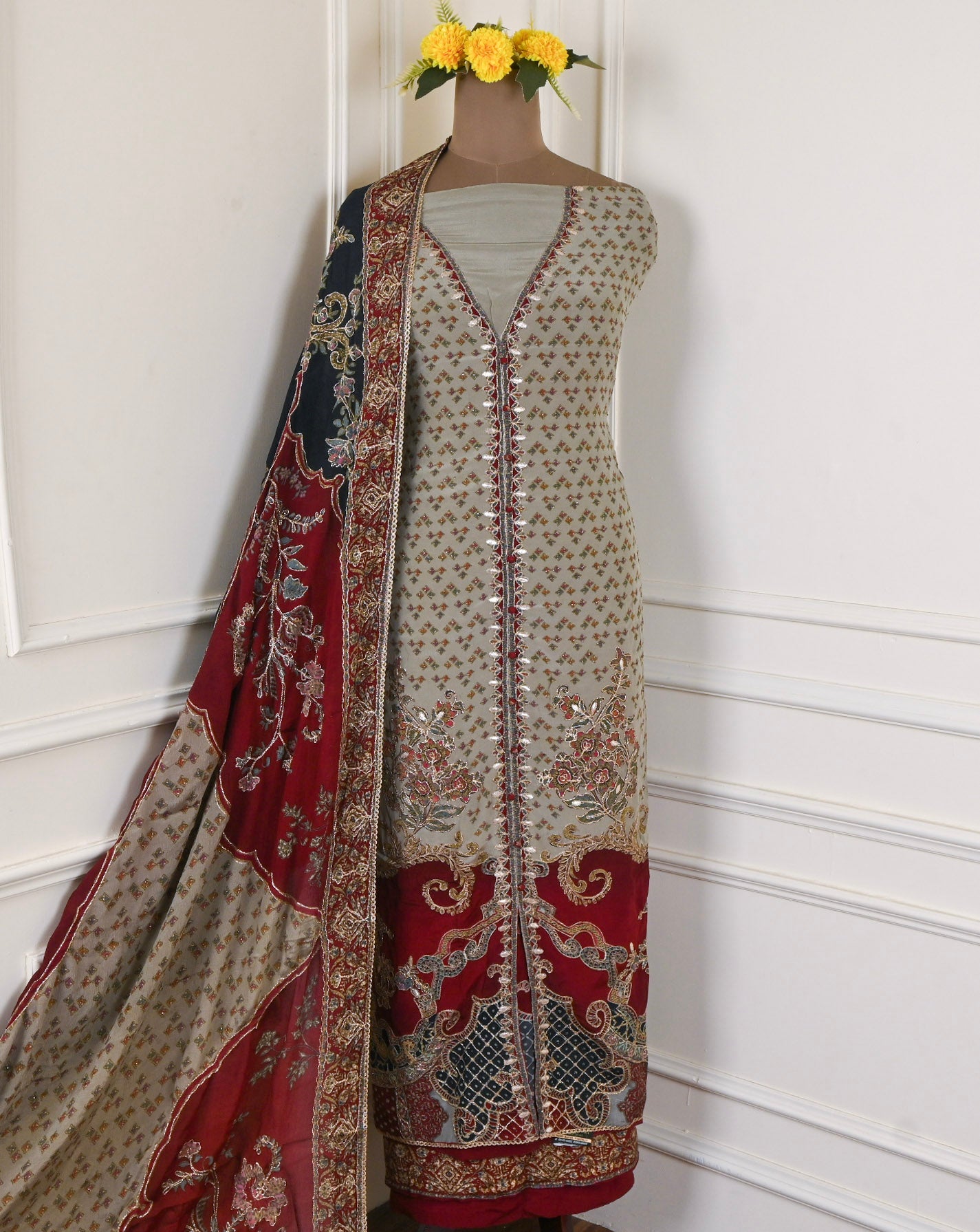 - Accompanied with an unstitched Crepe bottom and Chinon dupatta.