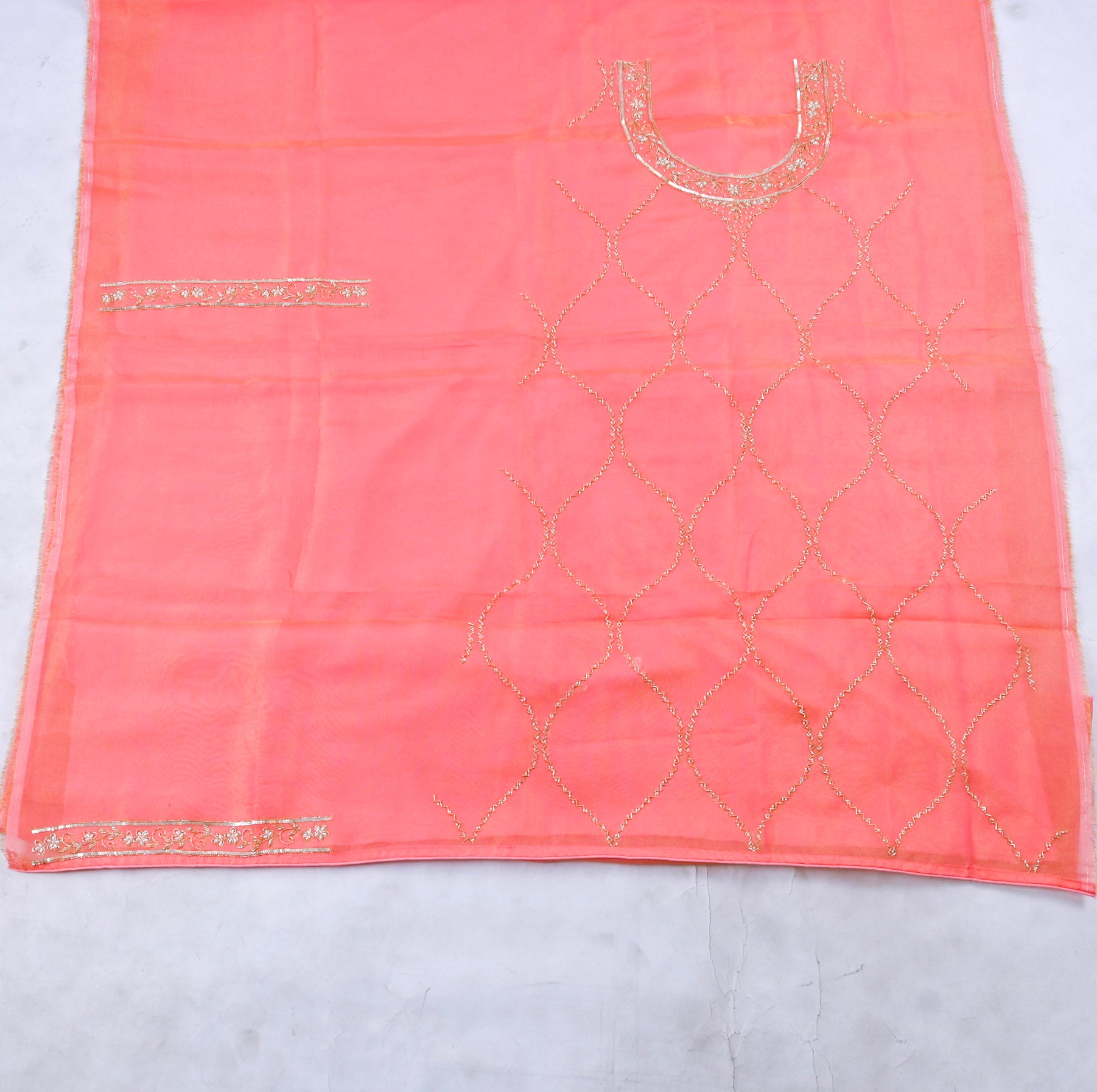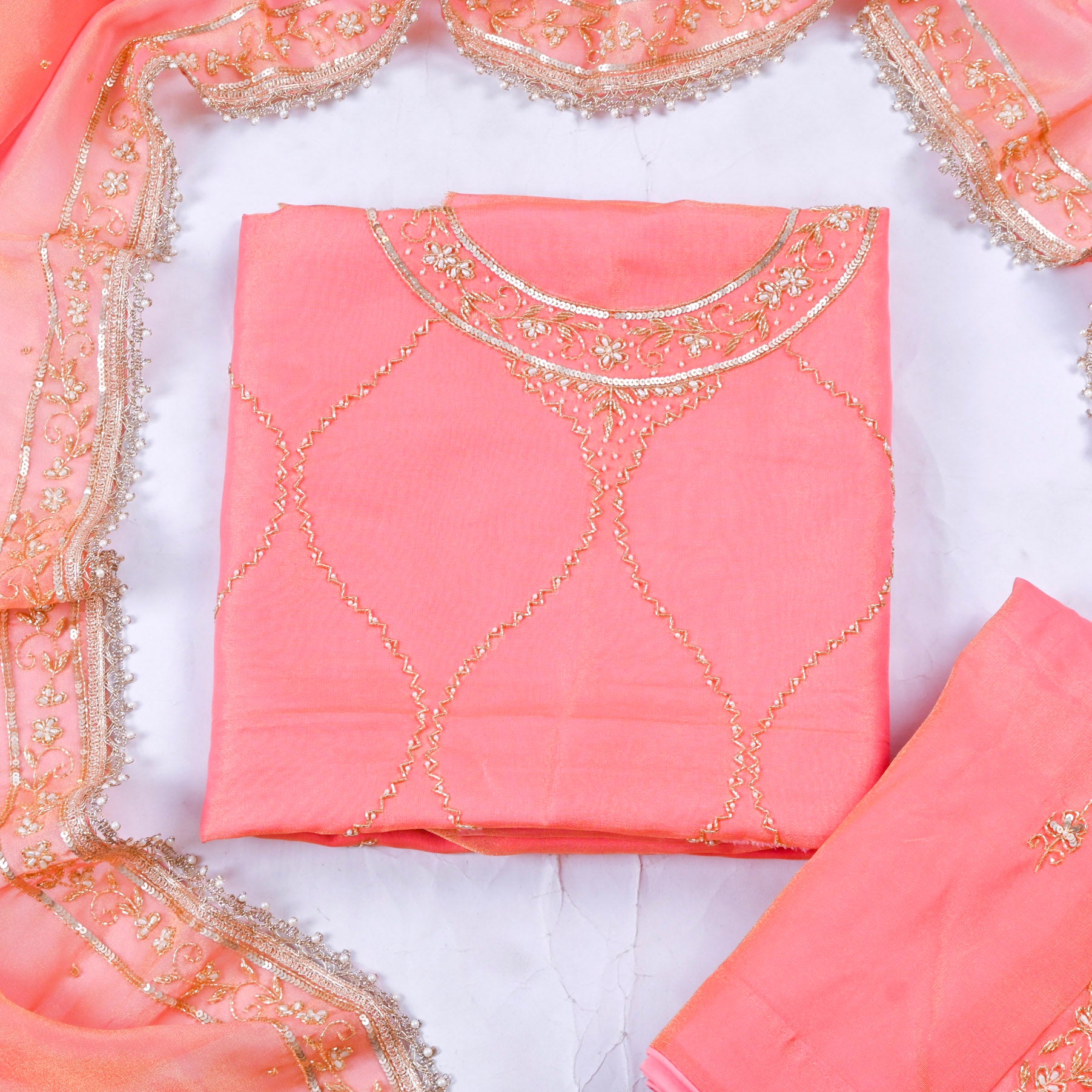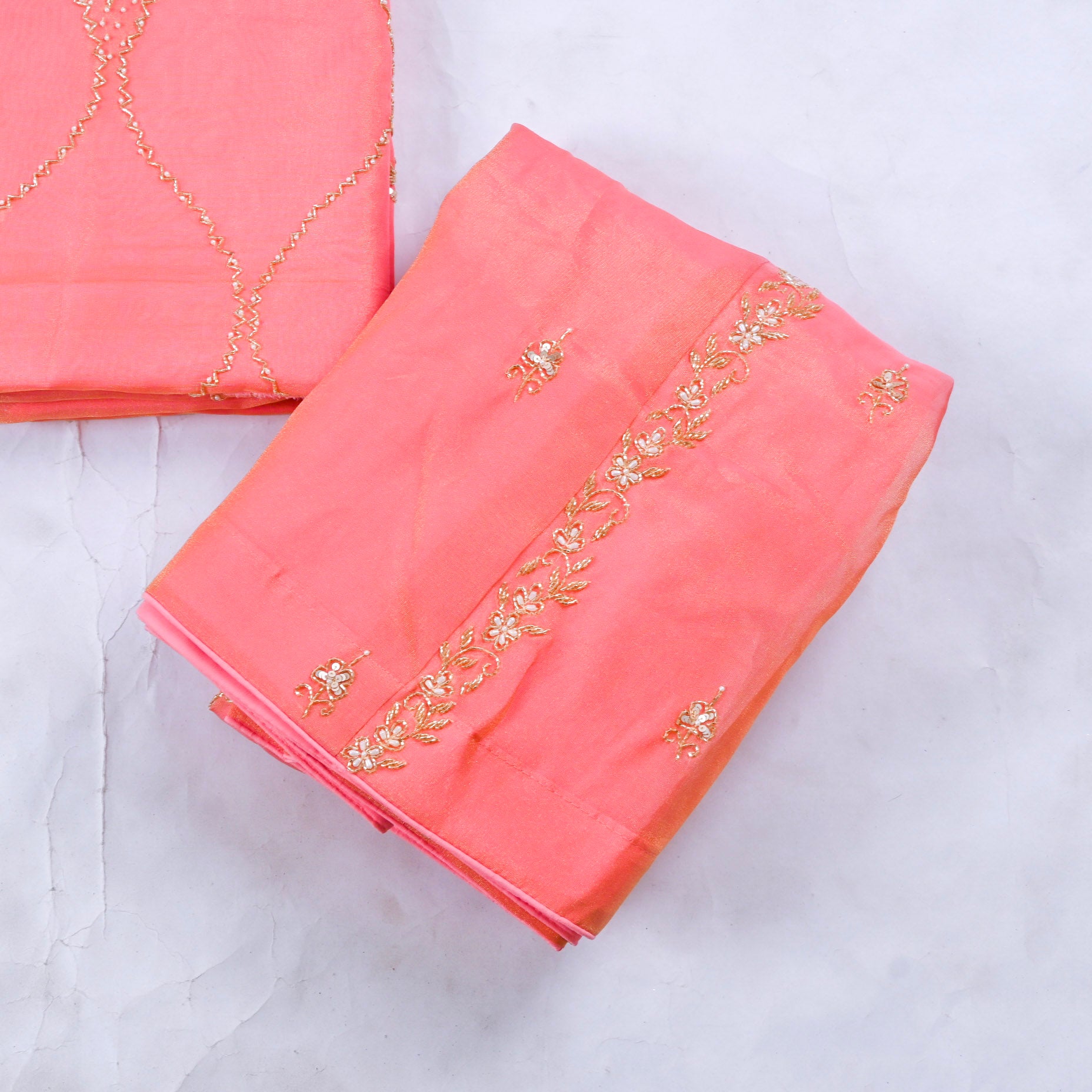 This exquisite Shimmer Peach Unstitched Lehenga Suit, a masterpiece that seamlessly blends traditional craftsmanship with contemporary elegance. The lustrous peach fabric catches light beautifully, creating a subtle shimmer that enhances your natural radiance at weddings, celebrations, and festive occasions. Meticulously tailored with intricate detailing, this three-piece ensemble features a perfectly proportioned lehenga, coordinating choli, and graceful dupatta.