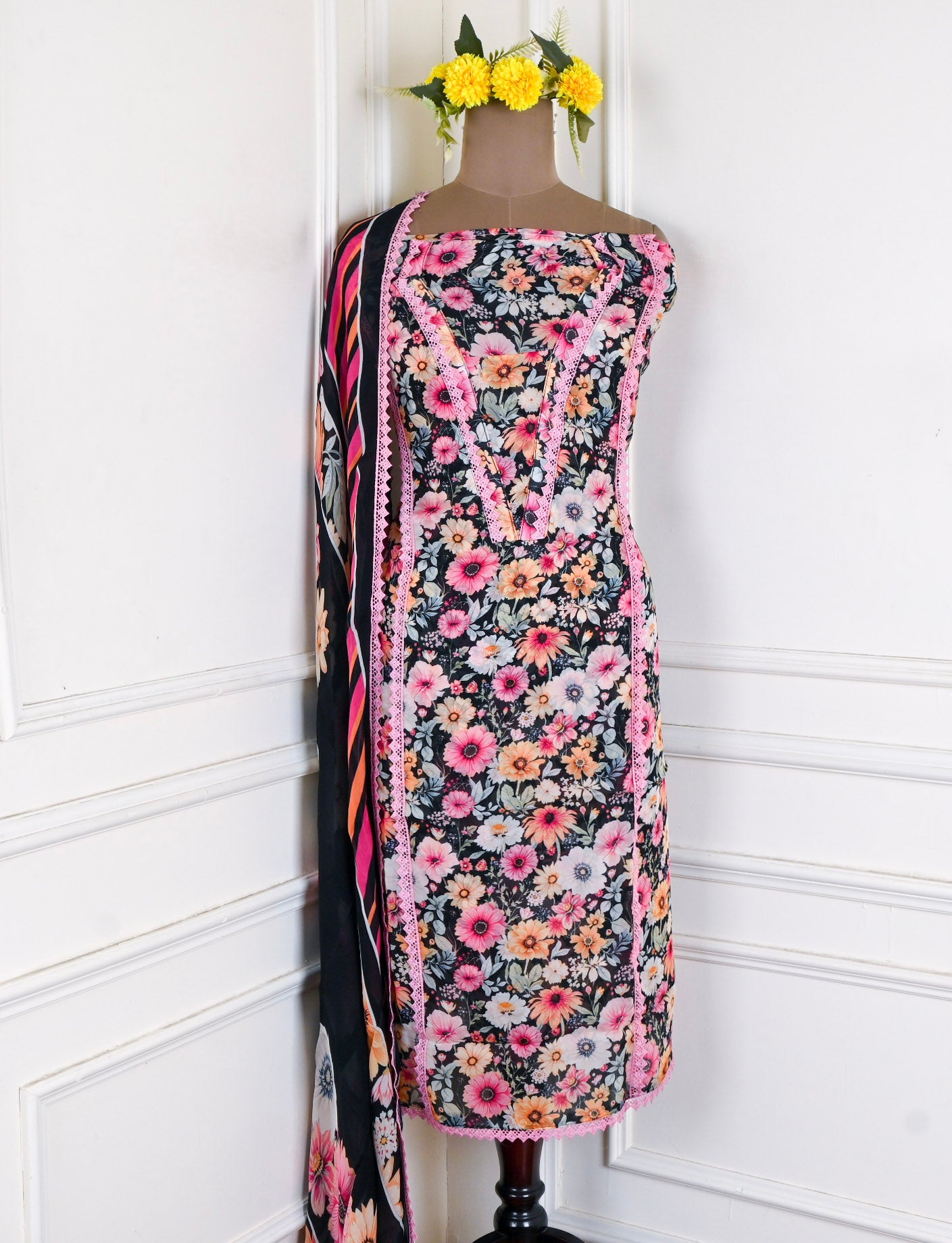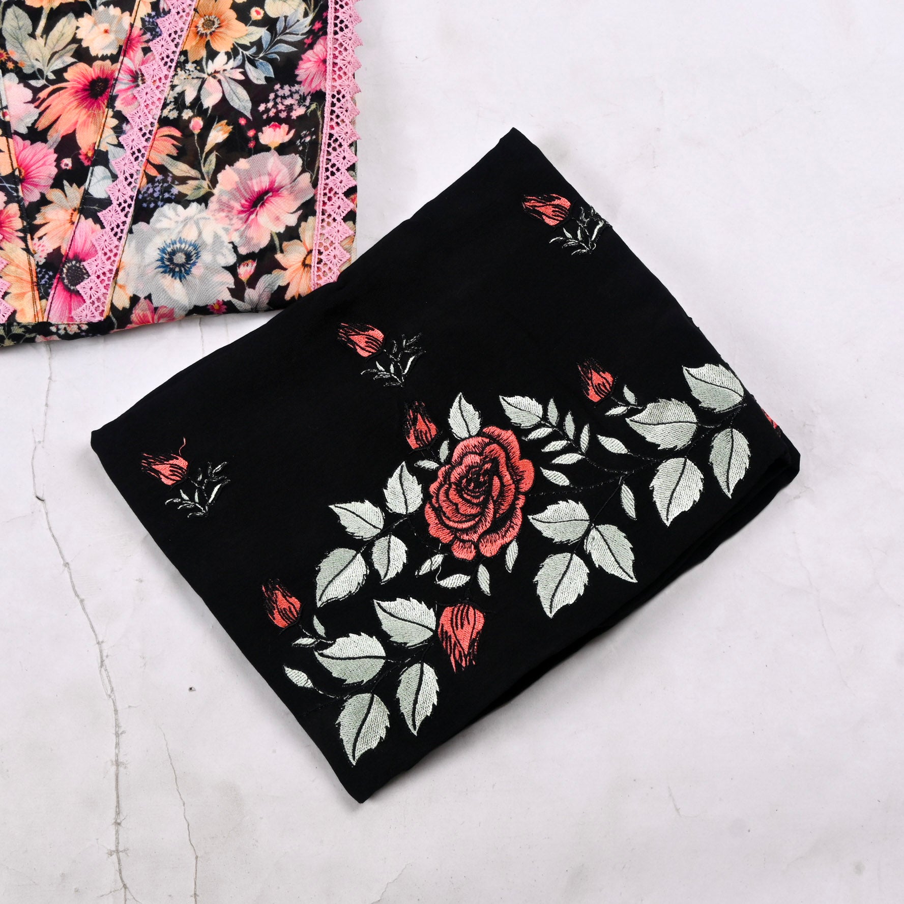 - Accompanied with an unstitched Muslin bottom and twill cotton dupatta.