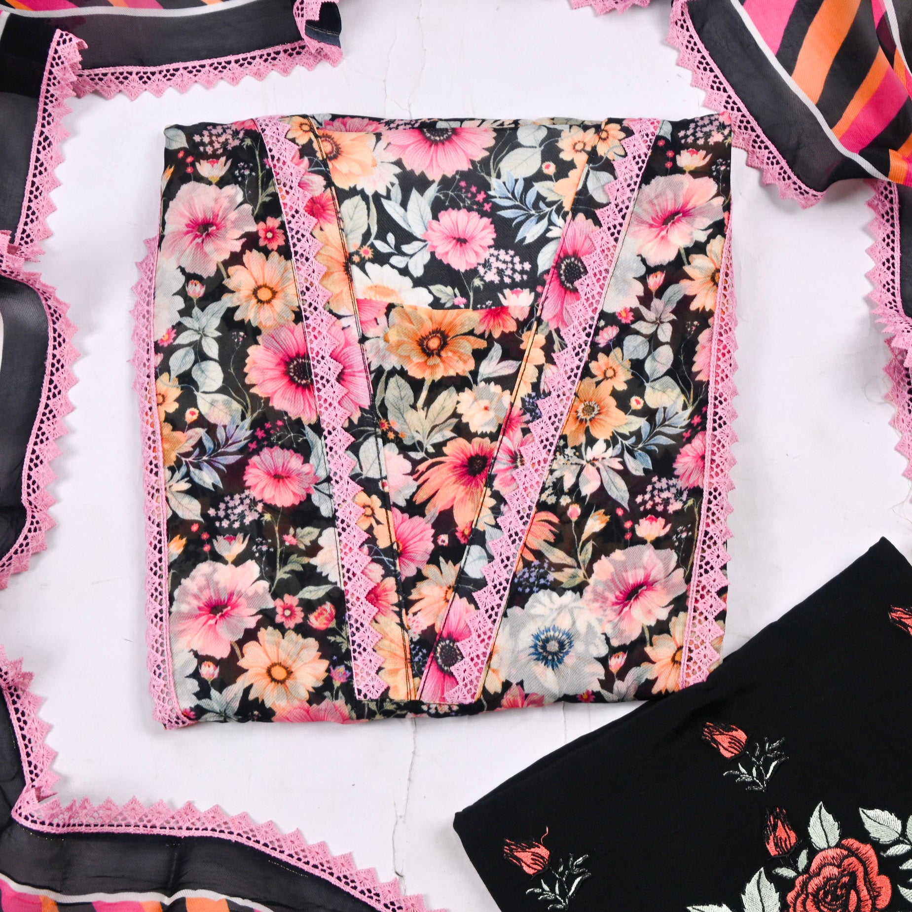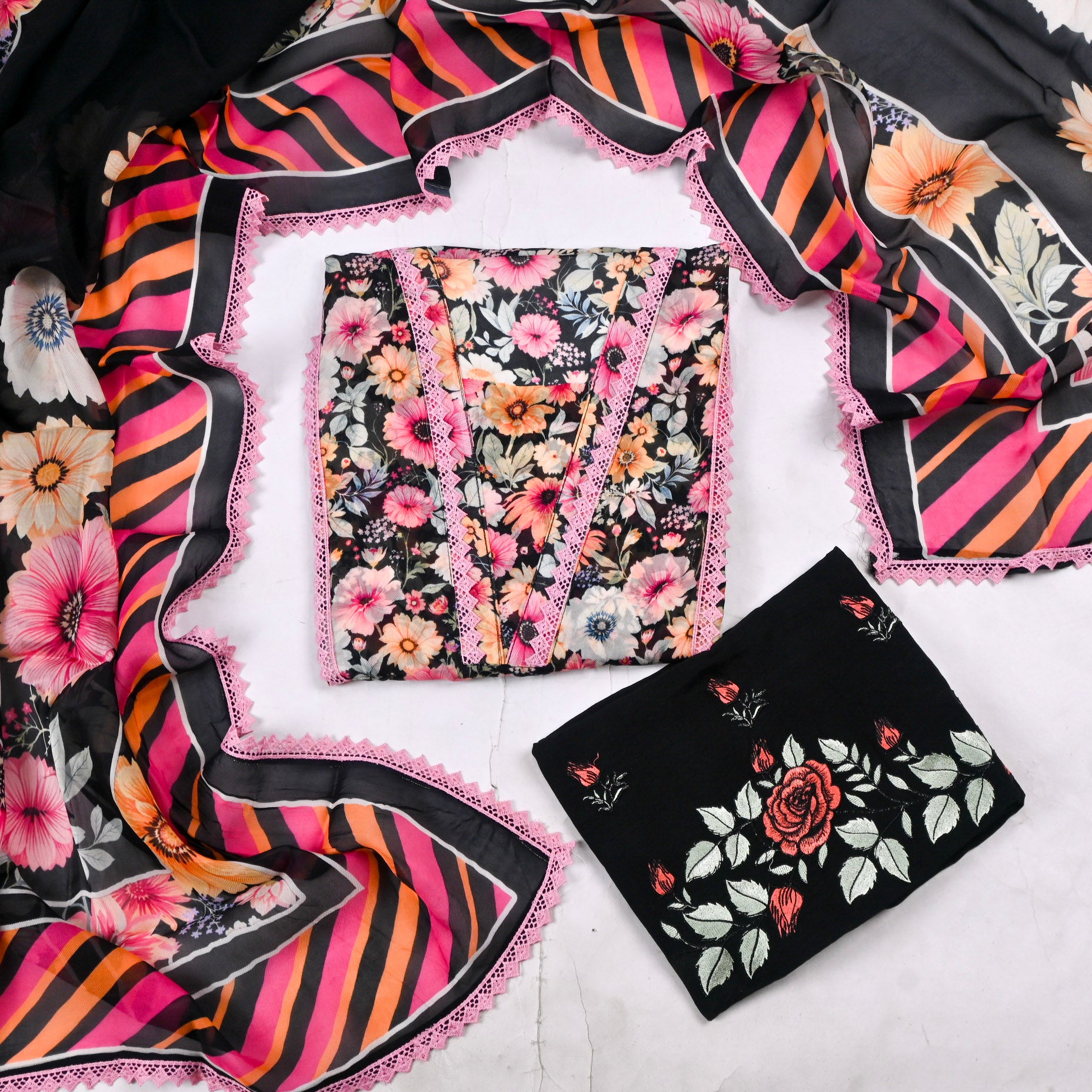 This elegant Unstitched Twill Cotton pink Suit is crafted in soft twill Organza fabric, perfect for effortless everyday style. This features beautiful floral prints with delicate neckline detailing that adds a graceful touch to the overall design. Paired with a matching printed twill cotton dupatta that enhances the charm of the outfit. The comfortable silk bottom completes the look, making it ideal for casual outings and day gatherings. A perfect blend of comfort, freshness, and timeless ethnic elegance for your wardrobe.