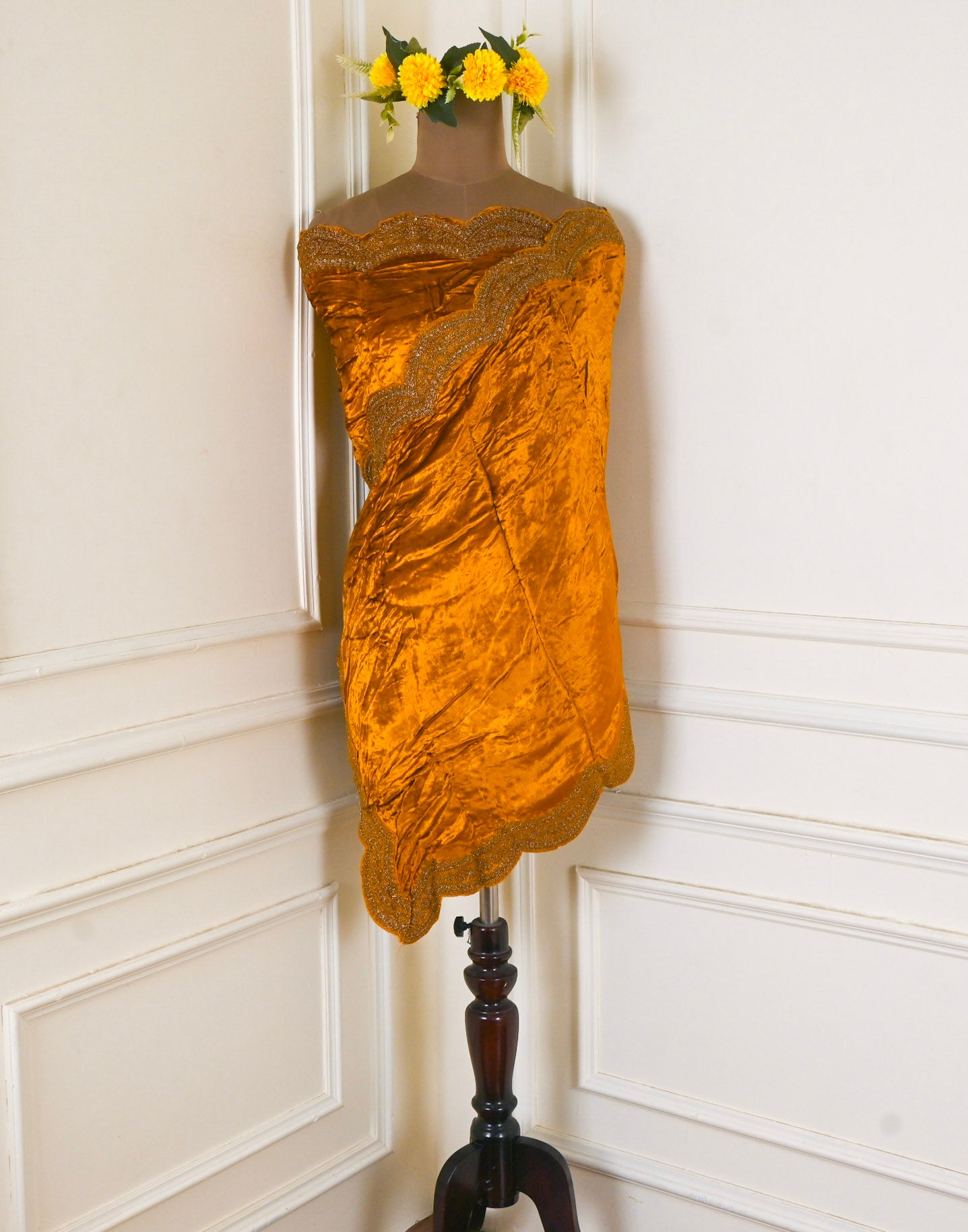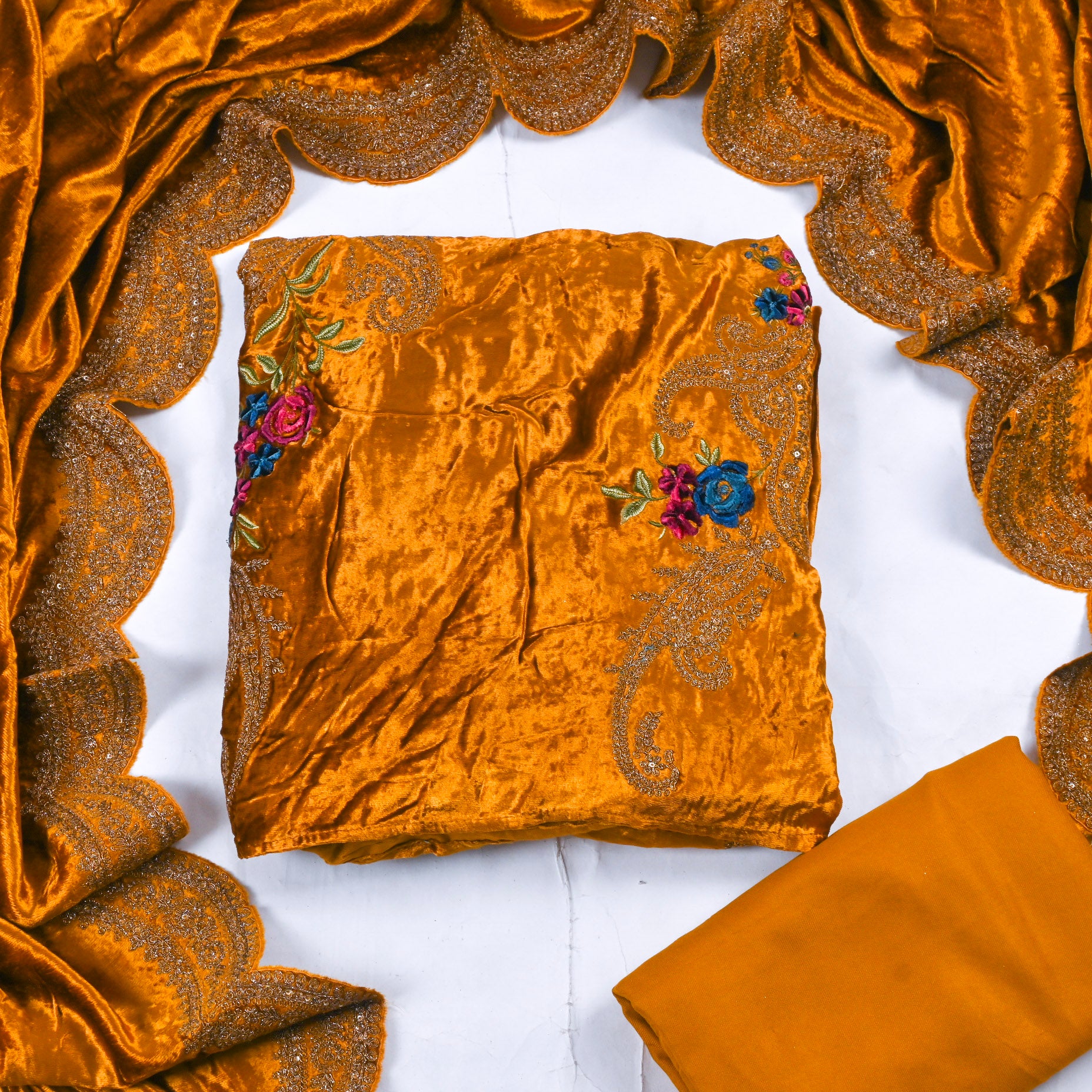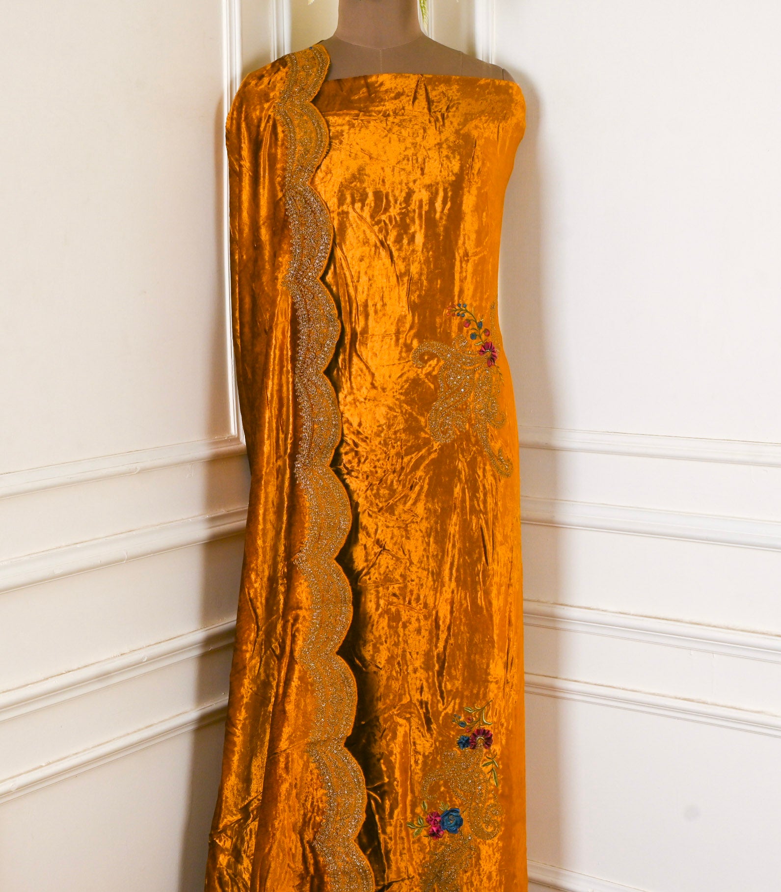 This luxurious Velvet Yellow Mustard unstitched suit, a timeless choice for those who appreciate refined craftsmanship. The rich, jewel-toned velvet fabric offers a sophisticated sheen and sumptuous texture, perfect for creating a bespoke ensemble tailored to your exact specifications. Unstitched designs provide complete creative freedom—customize the silhouette, neckline, and fit to match your personal style and body measurements.