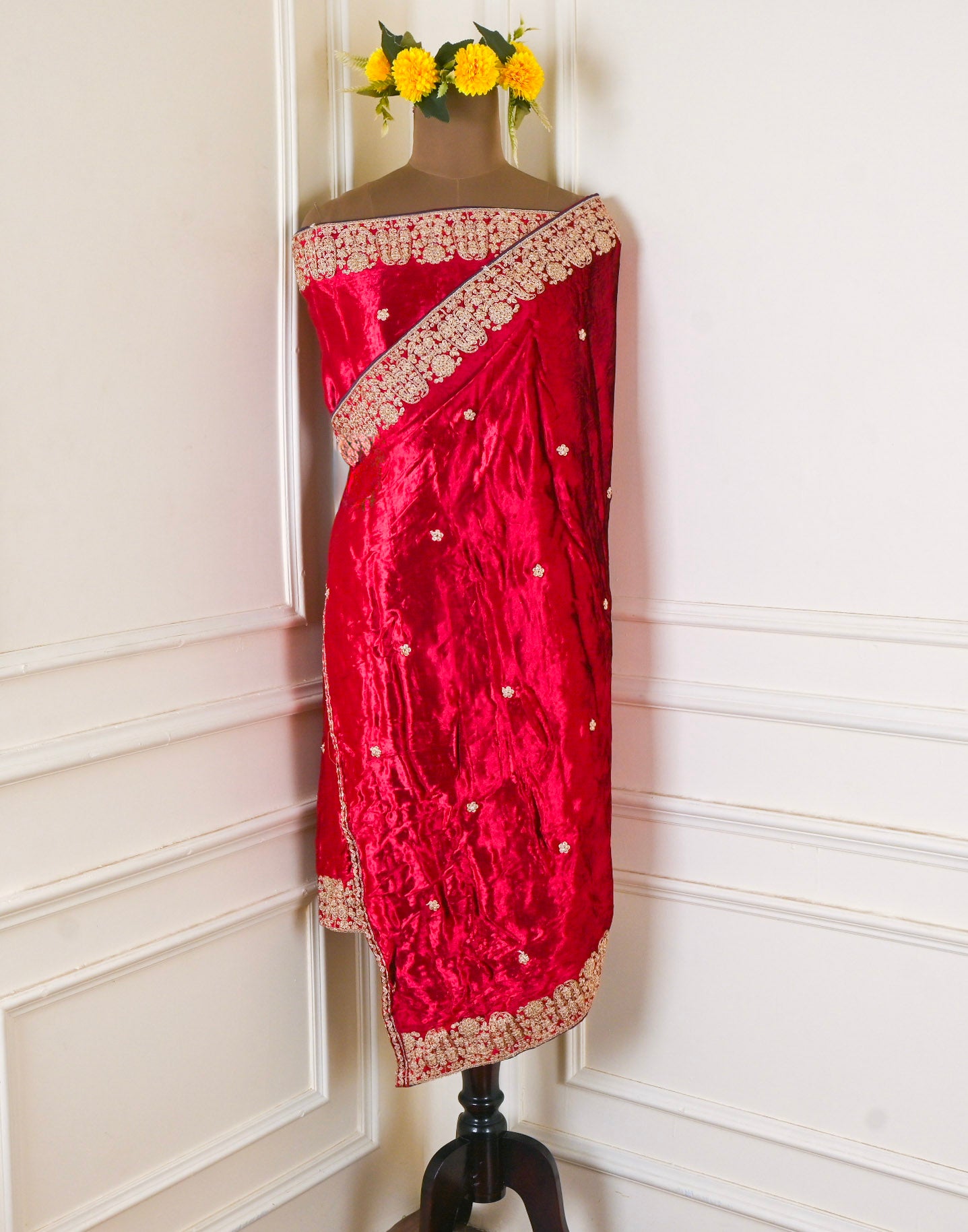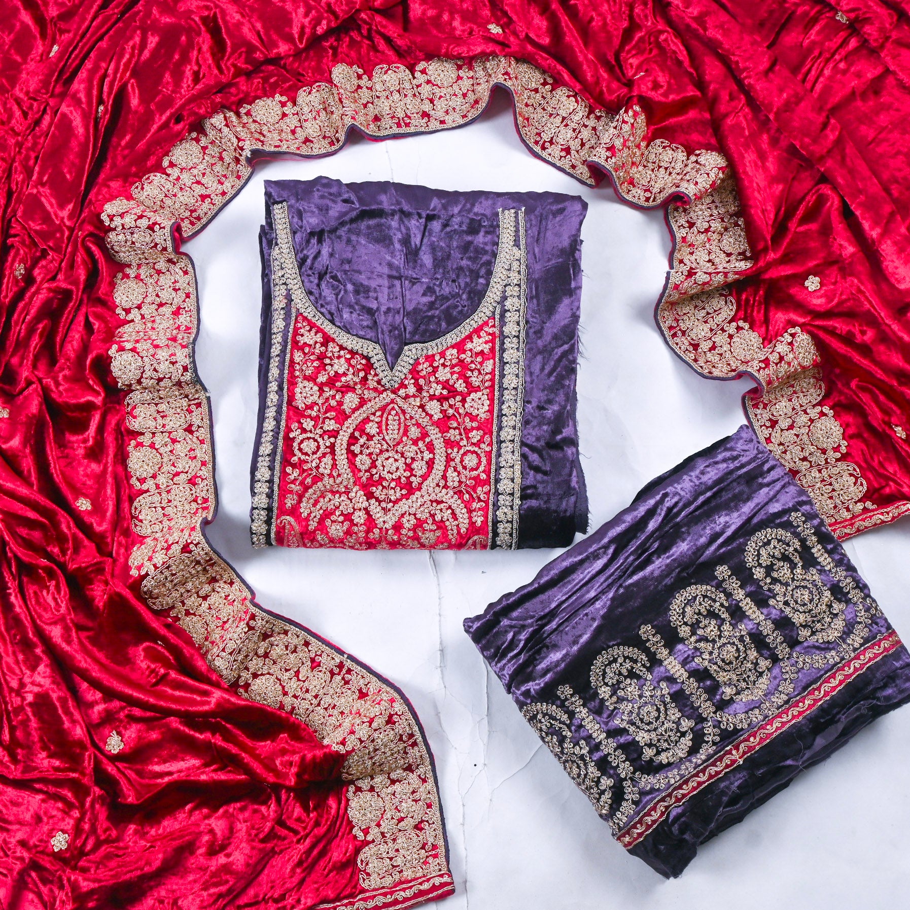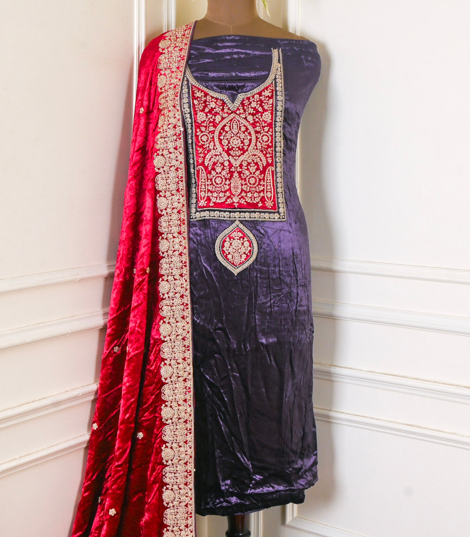 - Accompanied with an unstitched Velvet bottom and Velvet dupatta.