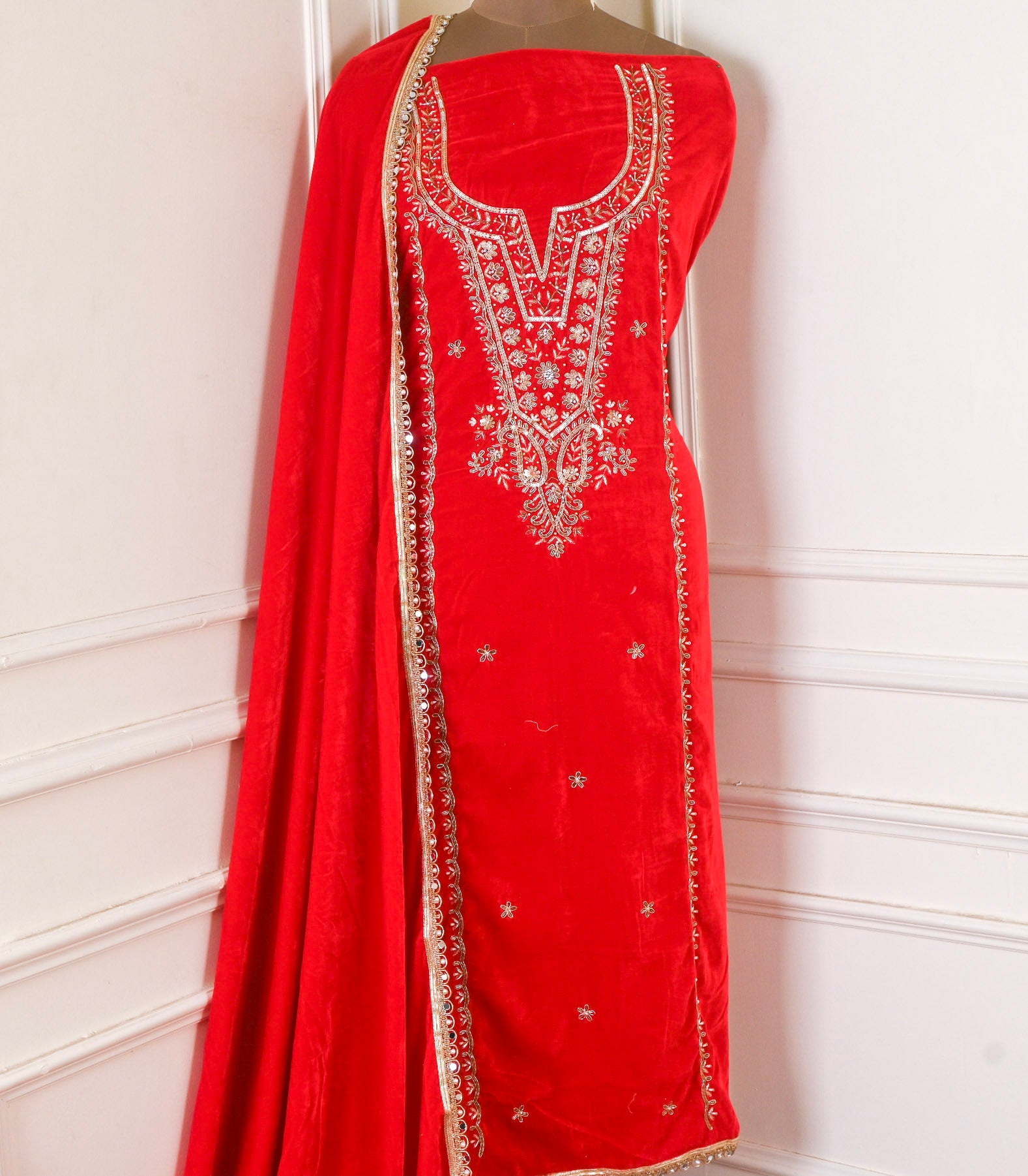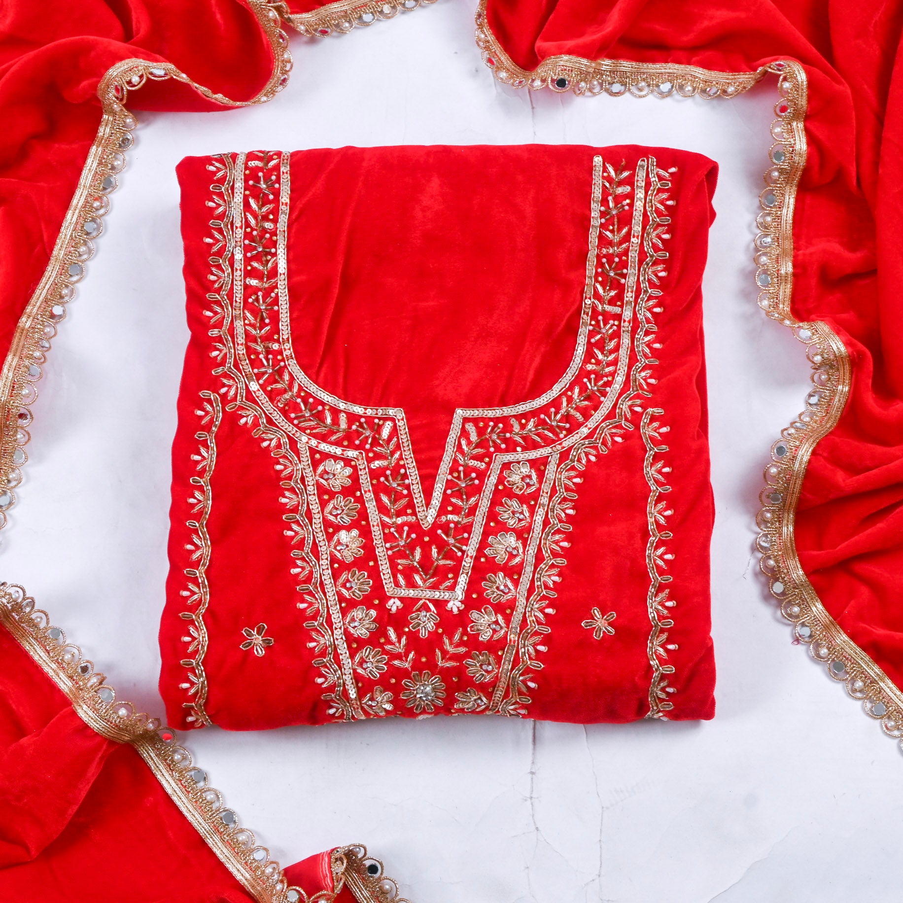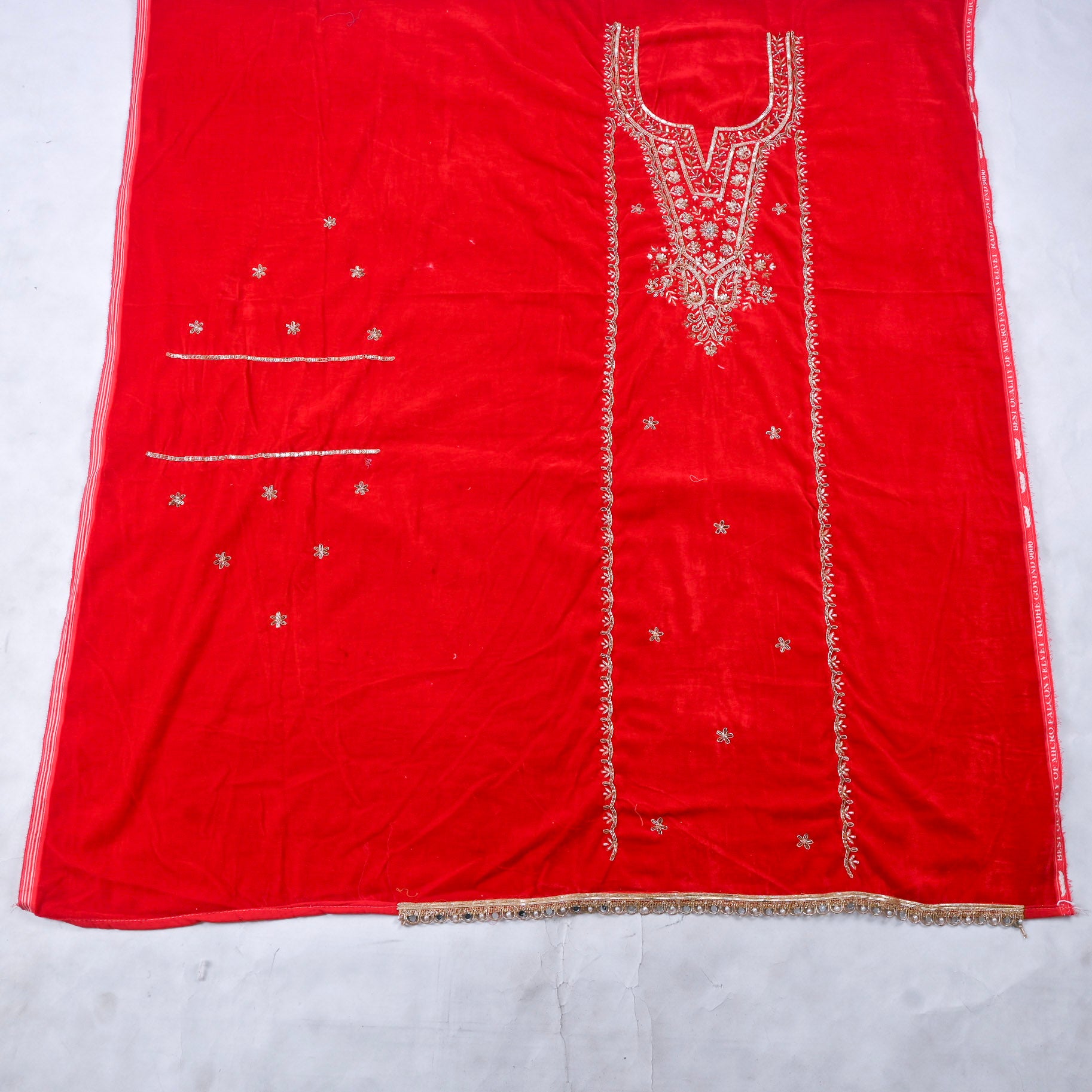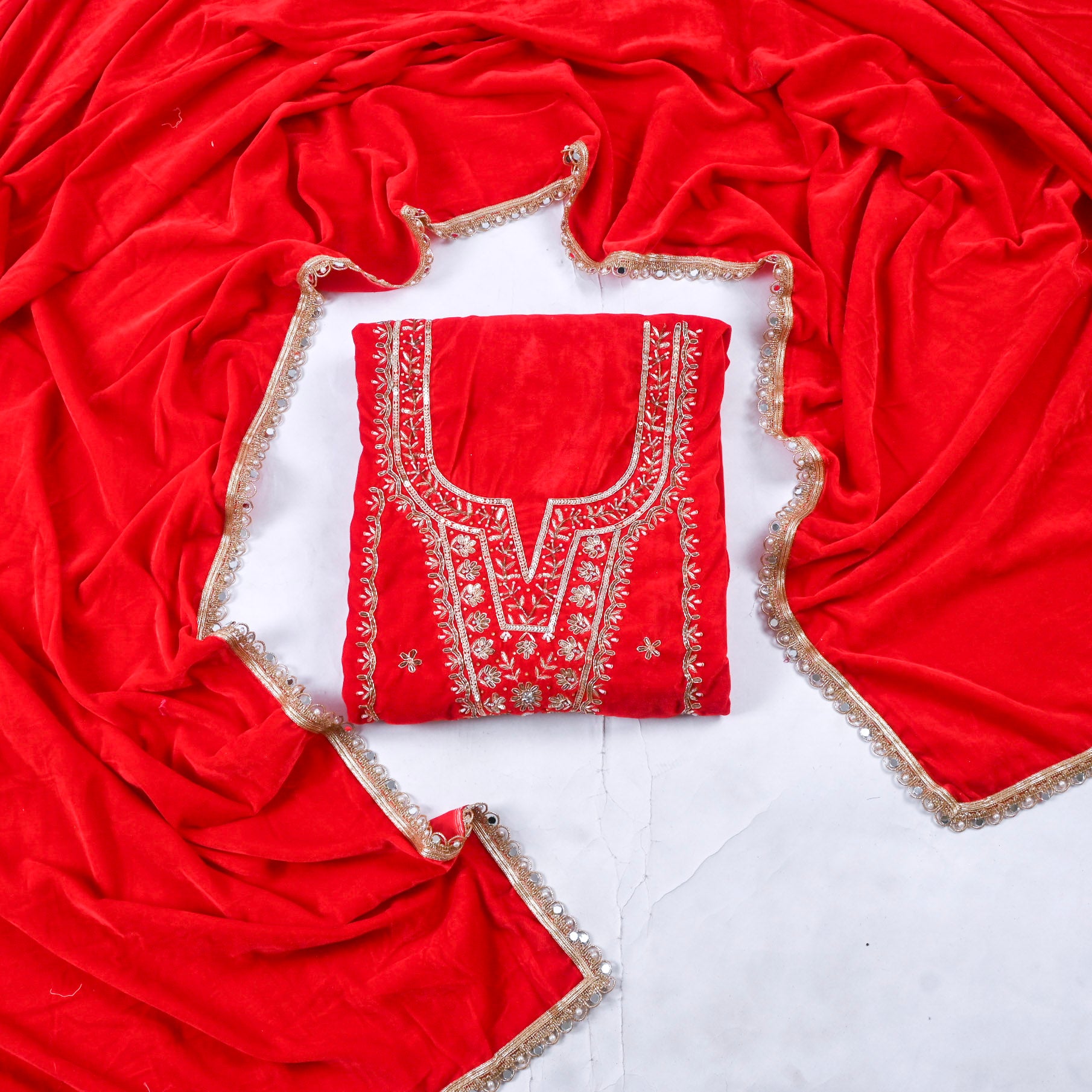 This luxurious Velvet Red unstitched suit, a timeless choice for those who appreciate refined craftsmanship. The rich, jewel-toned velvet fabric offers a sophisticated sheen and sumptuous texture, perfect for creating a bespoke ensemble tailored to your exact specifications. Unstitched designs provide complete creative freedom—customize the silhouette, neckline, and fit to match your personal style and body measurements.